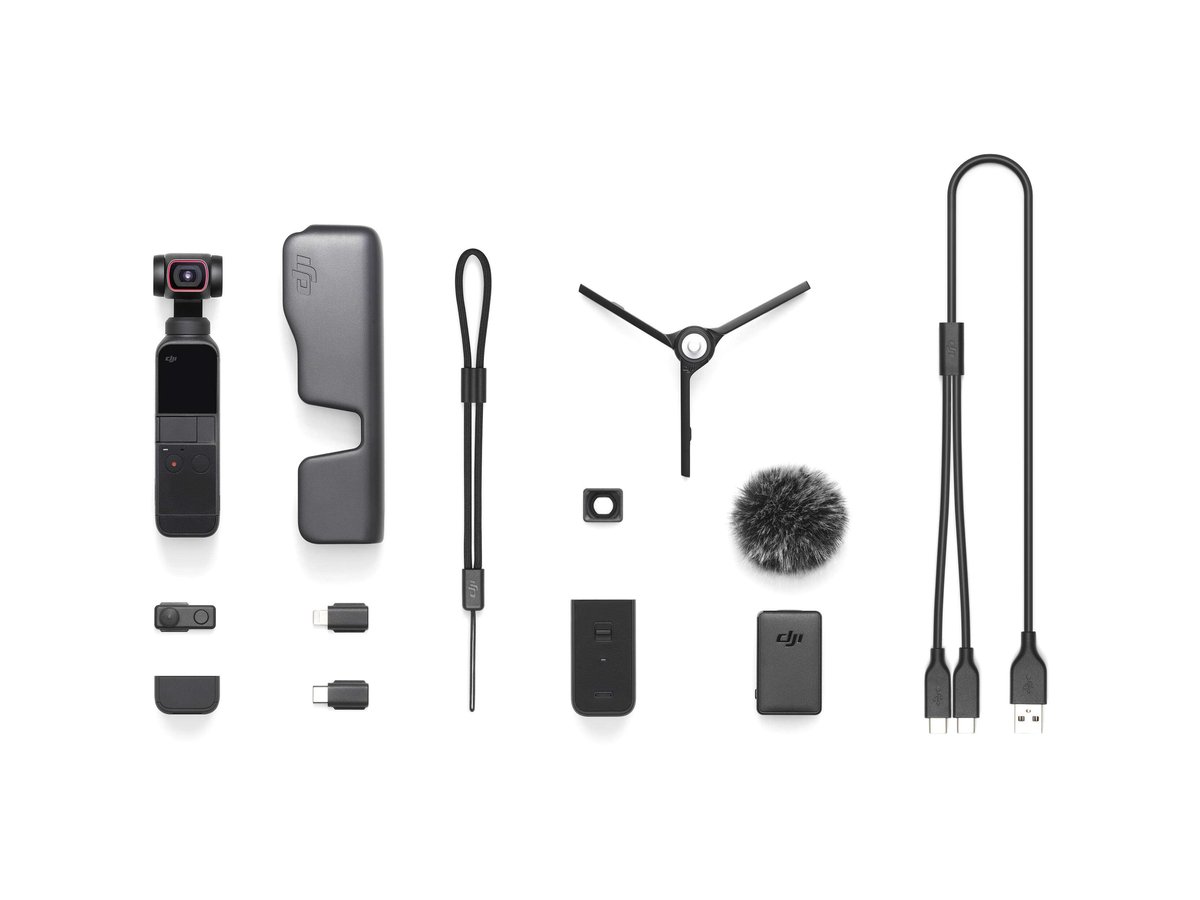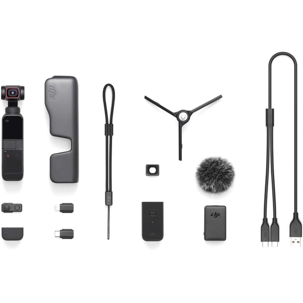 Additional accessories in the Creator Combo include a wide-angle lens, "Do-it-All" handle, USB Type-A to Type-C splitter, a wireless microphone transmitter, a wireless microphone windscreen, and a micro tripod. Other accessories such as a charging case, phone clip, and waterproof case are available separately to round out your Pocket 2 experience.
