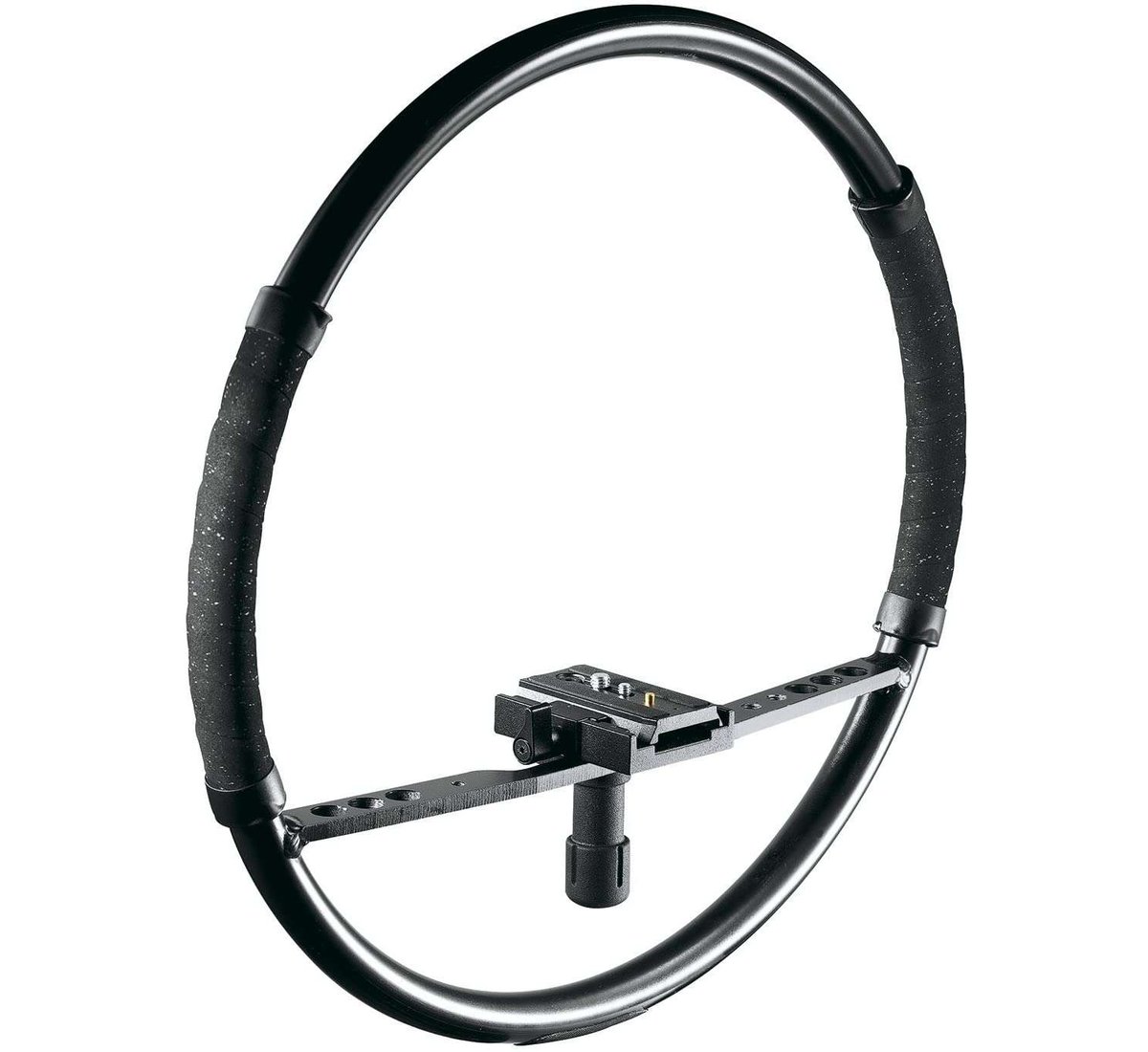 A circular frame with a crossbar to mount most mini DV cameras, allows the Fig Rig to become part of the body to produce smooth, steady traveling shots. As the operator walks, his/her muscles and tendons absorb all the shocks, transferring only fluid movements to the camera. As there are no straps or harnesses attached to the Fig Rig, quick and wide movements can be made within the same shot - from ground level to overhead, in one smooth movement. The camera, accessories and operator become one, allowing you to film scenes quickly and unobtrusively. With the Fig Rig your creativity is virtually limitless.