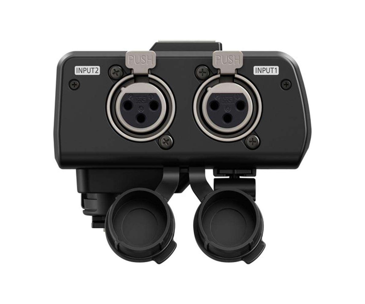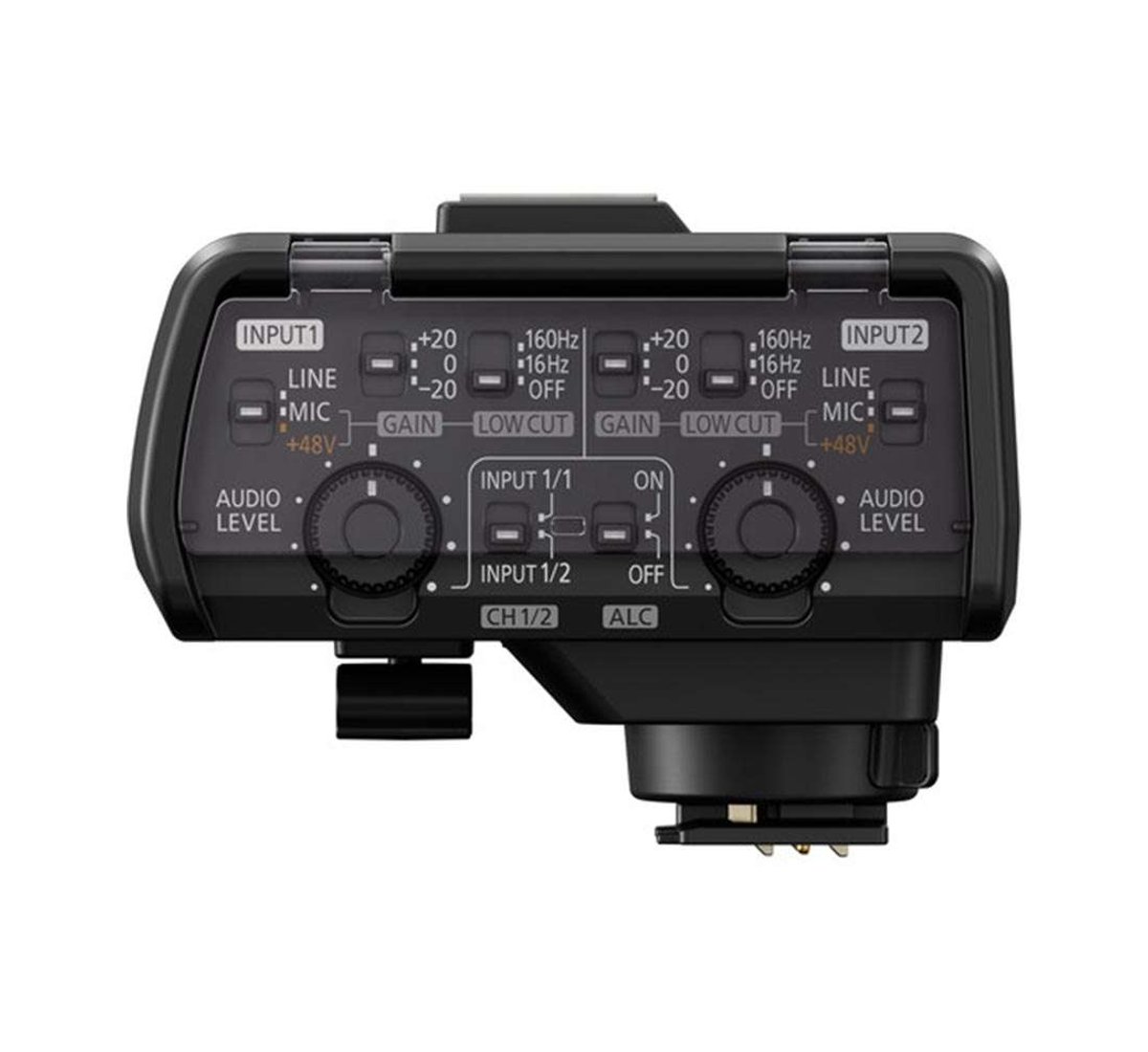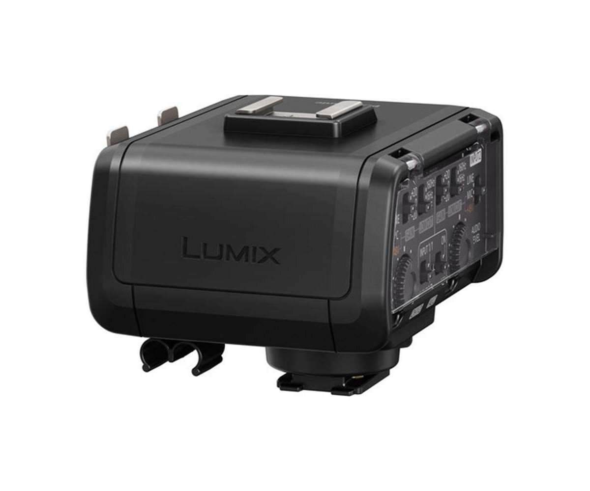 Expand the audio capabilities of your DC-GH5 mirrorless camera with this shoe-mounted DMW-XLR1 XLR Microphone Adapter from Panasonic. It connects to the camera directly through the hot shoe and provides two XLR inputs for using professional microphones. It also features a control panel with a clear cover that sports numerous physical dials and controls for changing the levels, gain, and low cut filter of each input individually. Also, it supports high-resolution recording formats up to 96 kHz and 24-bit. A cable clamp is present as well for cable management and a shoe mount on the top of the unit can support additional accessories. Additionally, it receives power directly from the camera.
