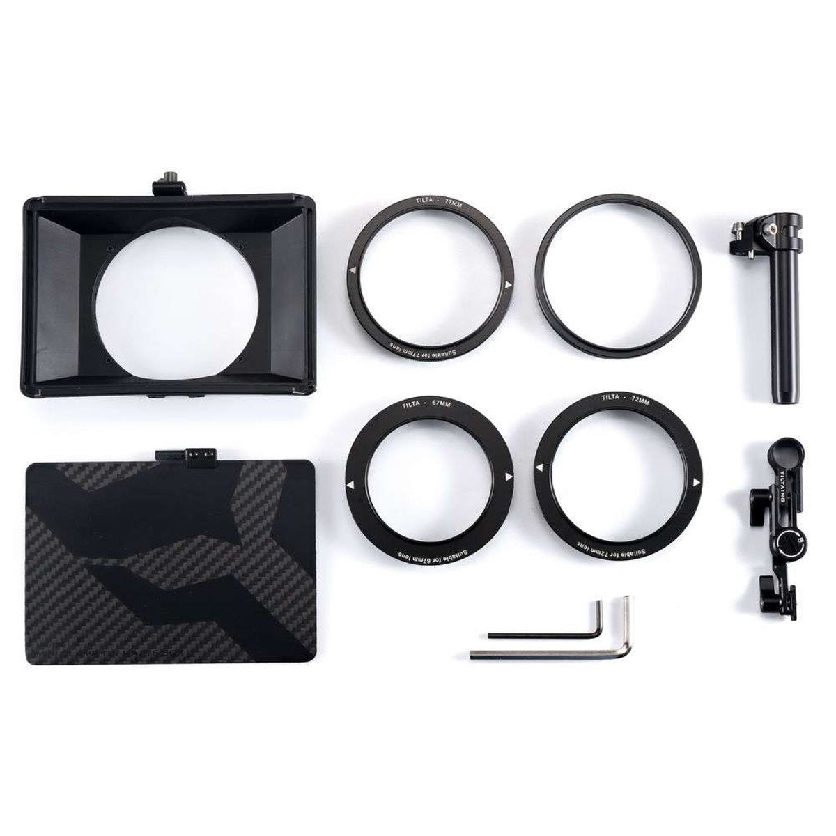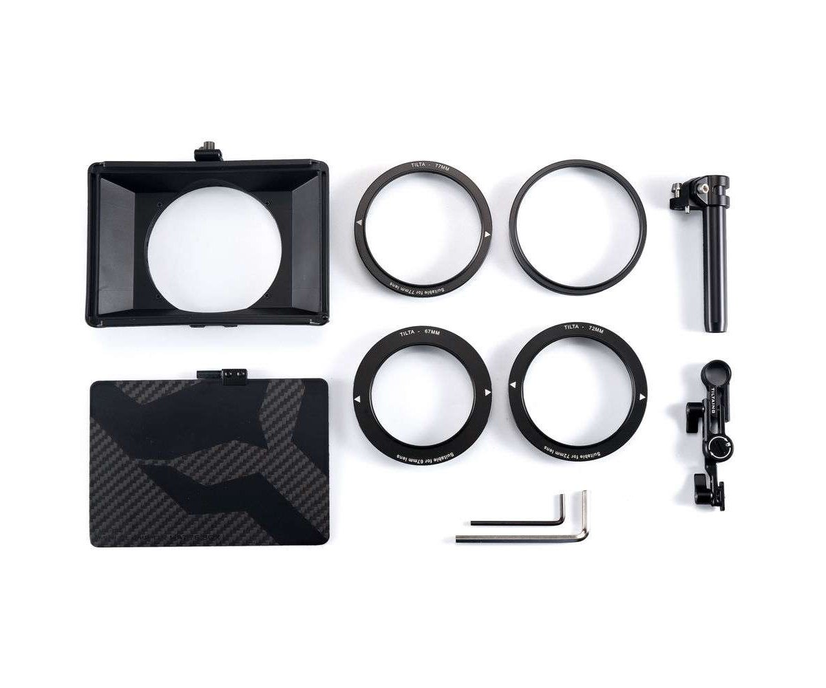 The kit includes the Mini Matte Box, top french flag, 15mm single rod support attachment, and four lens adapter rings (82mm, 77mm, 67mm, and 72mm). Additional adapter rings in non-standard sizes (52mm, 55mm, 58mm, 62mm, 85mm) as well as cine version adapter rings (80mm and 85mm) will be made available soon.