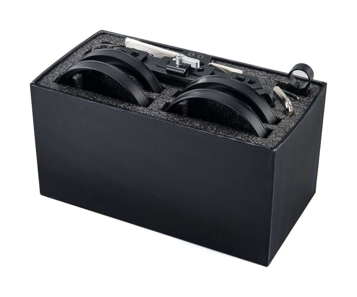 1/4″-20 and 3/8″-16 screw holes and cold shoe mounts provide several mounting points for a variety of accessories such as small LED lights or microphones. The kit also includes a 15mm rod adapter that attaches to the bottom of the matte box, providing support for the weight of the matte box as well as a way to secure your lens in place to provide lens stability (does not support lenses with front element telescoping).