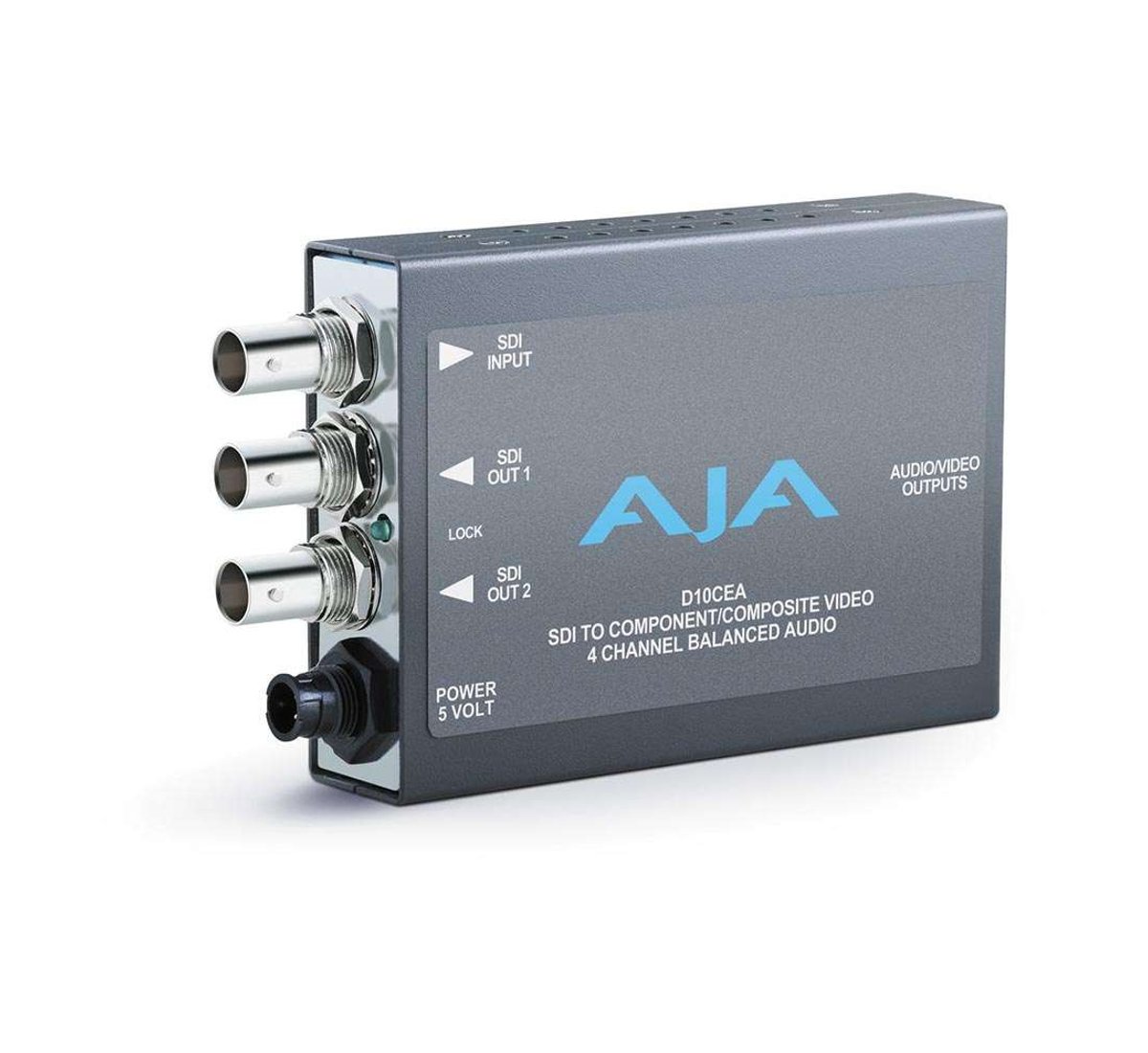 AJA's HD10CEA SD/HD-SDI to Analog Audio / Video Converter is a miniature monitoring solution that converts SD or HD SDI video with embedded audio to analog video and 4-channel balanced analog audio. SD-SDI video can be configured to output YPbPr, RGB or YC, and HD-SDI to YPbPr or RGB. Analog audio outputs are balanced and can be selected from group 1 to 4. A breakout cable with 25-pin D-sub connectors for the analog outputs is included and all configuration for conversion, for both video and audio, is done by external dipswitch selection. The converter also features two loop-thru SDI/HD-SDI outputs.