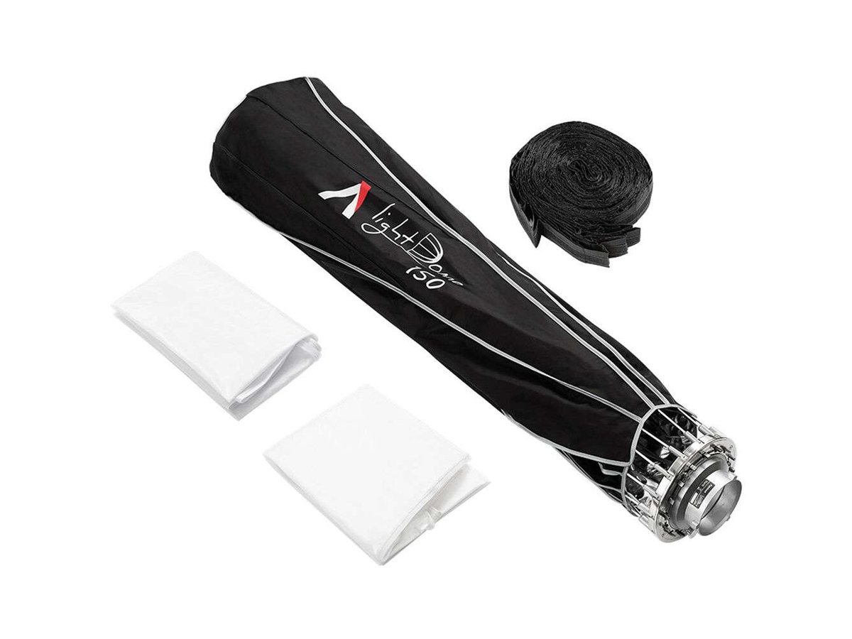 This 32-sided Light Dome 150 Softbox from Aputure measures 5' and is a great choice for portraits, head shots, interviews, fashion, and more. This is a really big light source with true wraparound quality that becomes more pronounced as you bring it closer to your subject. The softbox ships with 1.5- and 2.5-stop diffusers as well as a removable inner diffuser to thwart the hot spot.