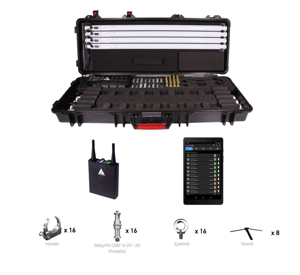 This Set of 8 Titan Tubes with Charging Case from Astera is a formidable setup destined for the road. The set includes eight Titan Tube LED lights and a hard, shippable charging case with a DMX-compatible PowerBox that can actually charge the tubes with them inside. Astera has provided a full array of mounting options including sixteen holders with cotter pins for truss mounting, and sixteen spigots for joining tubes together and to be used as mounting studs for the eight included floor stands.