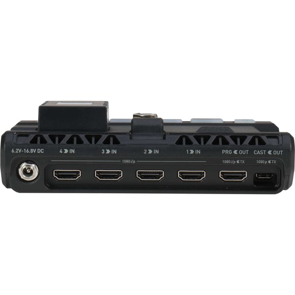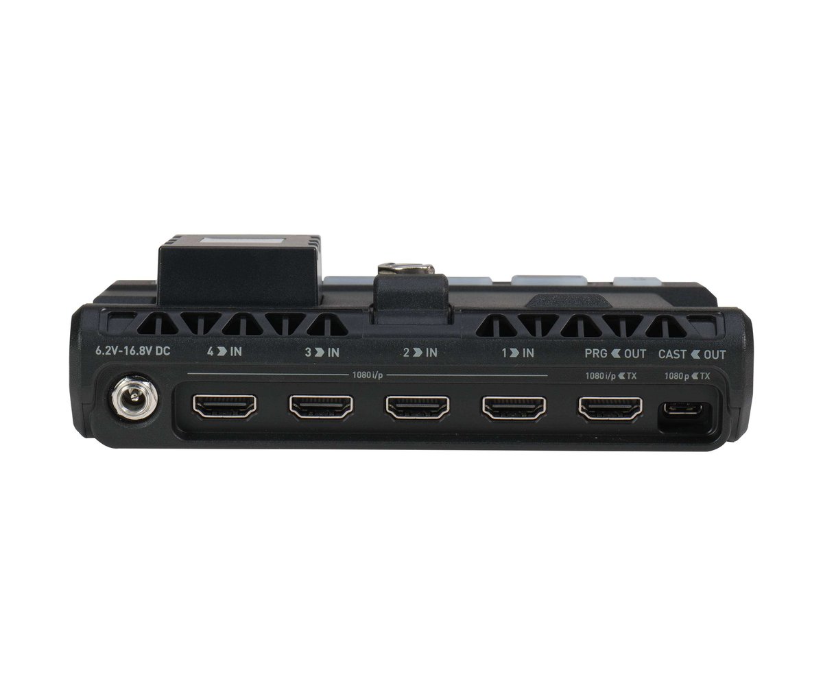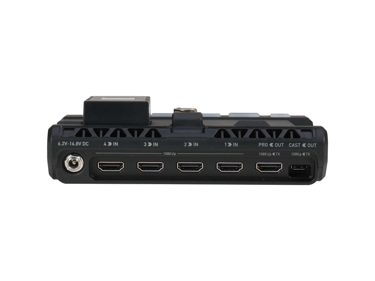 The CAST is specially designed to mount onto the back of the Ninja V/V+ monitor, and it provides four HDMI inputs that support a mix of different resolutions up to 1080p60. The touchscreen monitor can view a single image, Picture-in-Picture, or 4-Up modes, and you can also add logos and graphic overlays. It can send Program, Preview, Picture-in-Picture, and 4-Up displays to the HDMI output. You can select the source for monitor/output using the four source buttons, and you can also select the source using the monitor touchscreen. There are also four programmable function buttons to perform specific shortcuts.