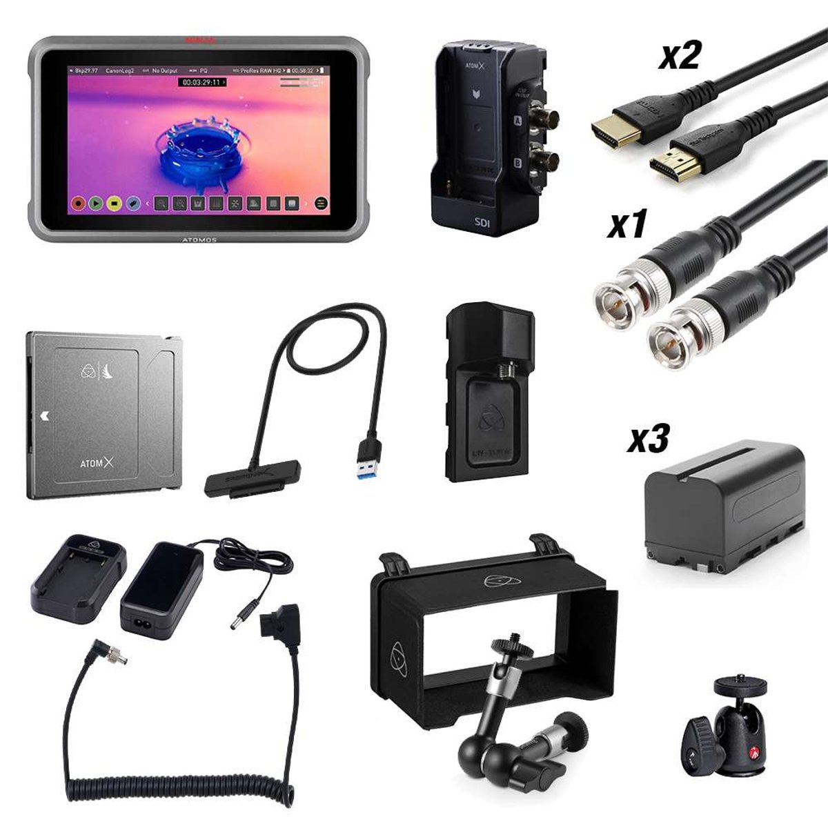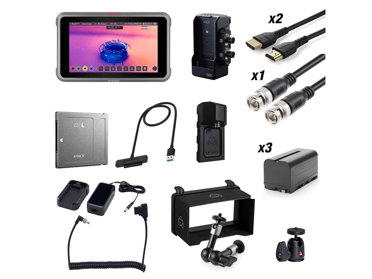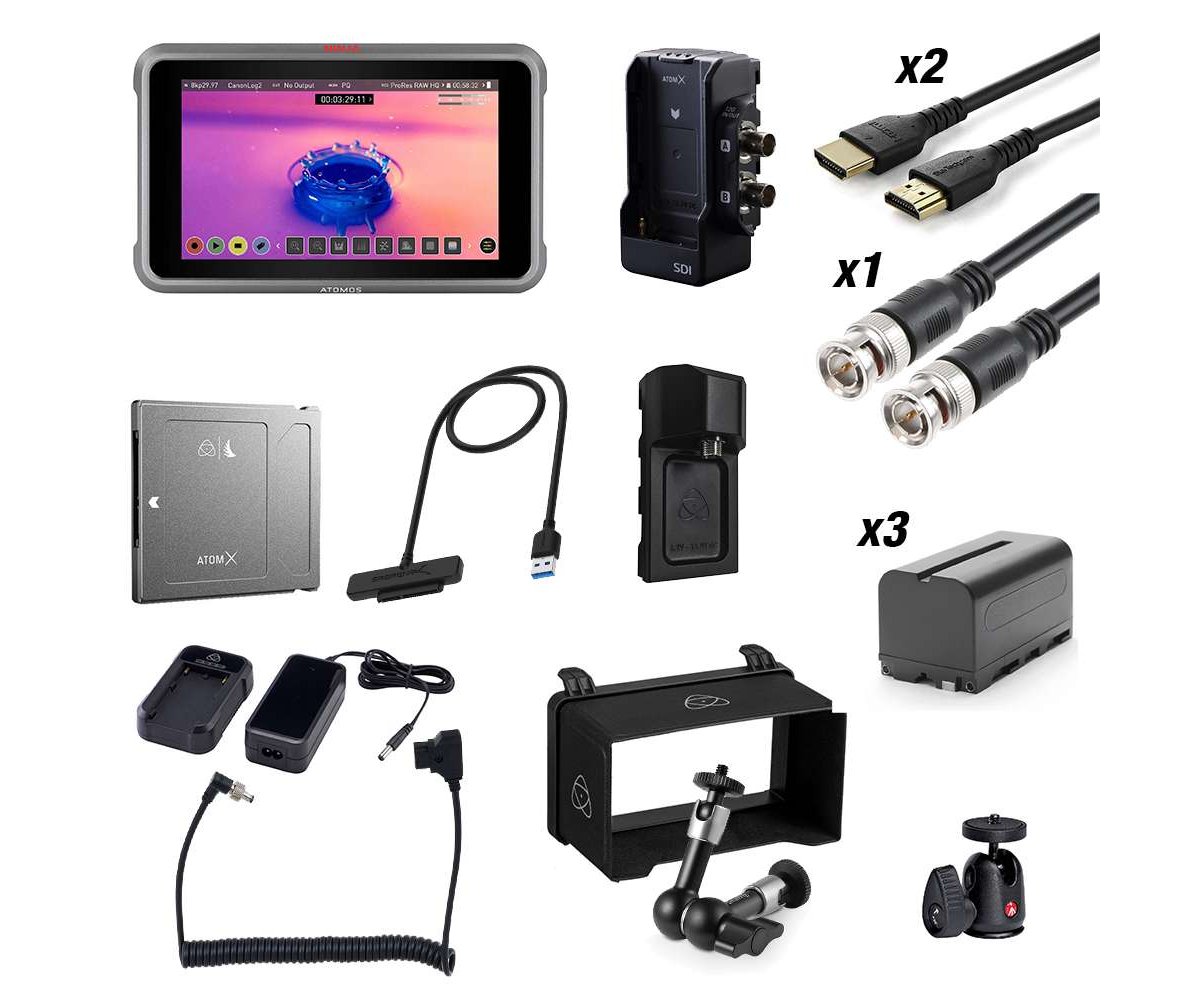 This kit's AtomX SDI module adds two 12-SDI ports to the Ninja V monitor's HDMI output, offering the flexibility of up to three simultaneous video outputs. The SDI raw license enables support of up to 8K ProRes raw video via both the HDMI and SDI outputs, as well as up to DCI 4K120 ProRes. Cross conversion options include HDMI raw to SDI output and the ability to crop and down-convert DCI and UHD 4K for compatibility with EVFs and wireless video transmitters/receivers without adding other converters. A sun hood, battery eliminator, a power adapter, a locking D-Tap power cable, and a hard case round out this handy kit.