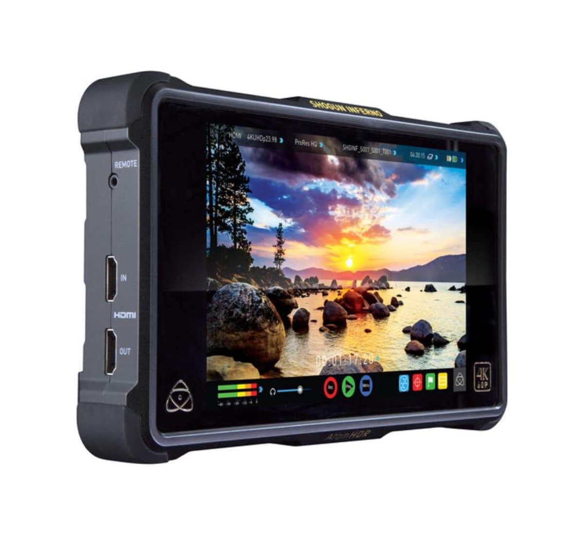 The Atomos Shogun Inferno is a 7", 1920 x 1200 on-camera recording monitor that combines 4K recording with a 10-bit FRC panel that supports native display of HDR (log) footage as well as high-brightness viewing of Rec. 709 footage. It utilizes 4K HDMI and 12G-SDI inputs to support clean output signals at resolutions up to UHD 4K (3840 x 2160) at 60 fps, recording it to 2.5" SSDs using 10-bit, 4:2:2 Apple ProRes, and Avid DNxHR codecs. The Inferno, unlike the similar Shogun Flame, supports Quad 3G-SDI input. It even supports DCI 4K (4096 x 2160) raw video streams over SDI from select Sony and Canon cameras, encoding it as ProRes/DNxHR files.