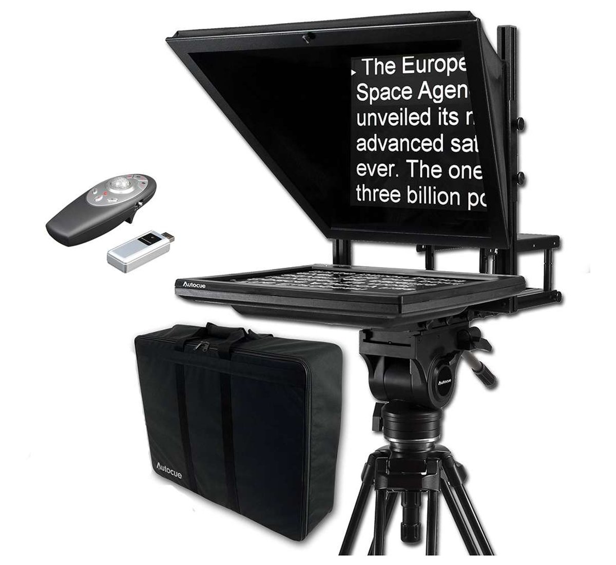 The Starter Series 17" from Autocue/QTV is a complete, entry-level prompting package compatible with all cameras from DSLR to standard size ENG without a counterbalance weight. This solution uses a mounting system with 3 possible configurations: on-camera, straight-read above camera, and floor- or tripod-standing straight-read.