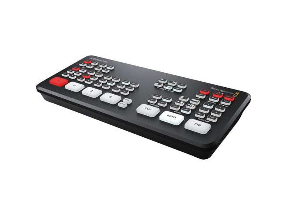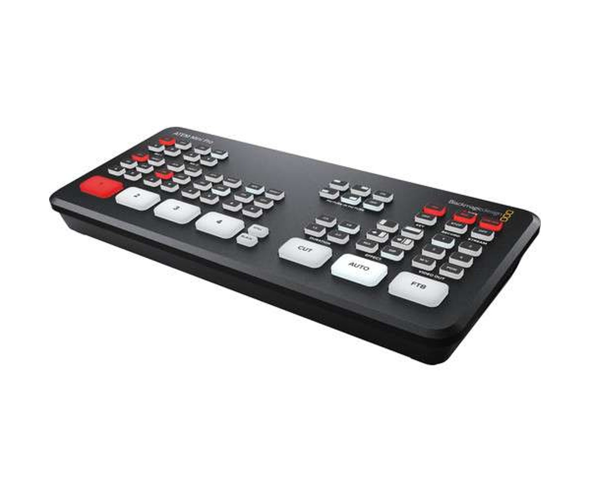 Similar to its predecessor, the ATEM Mini, the ATEM Mini Pro from Blackmagic Design is a four-input live production switcher with an integrated control panel designed for multicamera live streaming up to HD video to the internet or broadcast applications from gaming consoles, corporate computer streams, or HD cameras. Along with the software control update, the Mini Pro builds on the Mini with features such as live stream data rate and status information, a built-in hardware encoder, simultaneous recording to USB drives, drive hot swapping with the Blackmagic MultiDock, added record and stream buttons, stream caching, a timecode generator, program preview multiview, tally support, and support for Blackmagic Design Pocket Cinema Camera 6K and 4K to utilize as your broadcast sources.