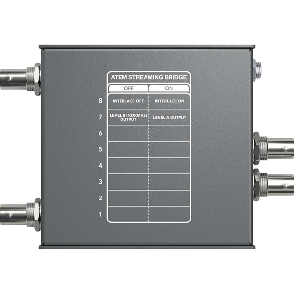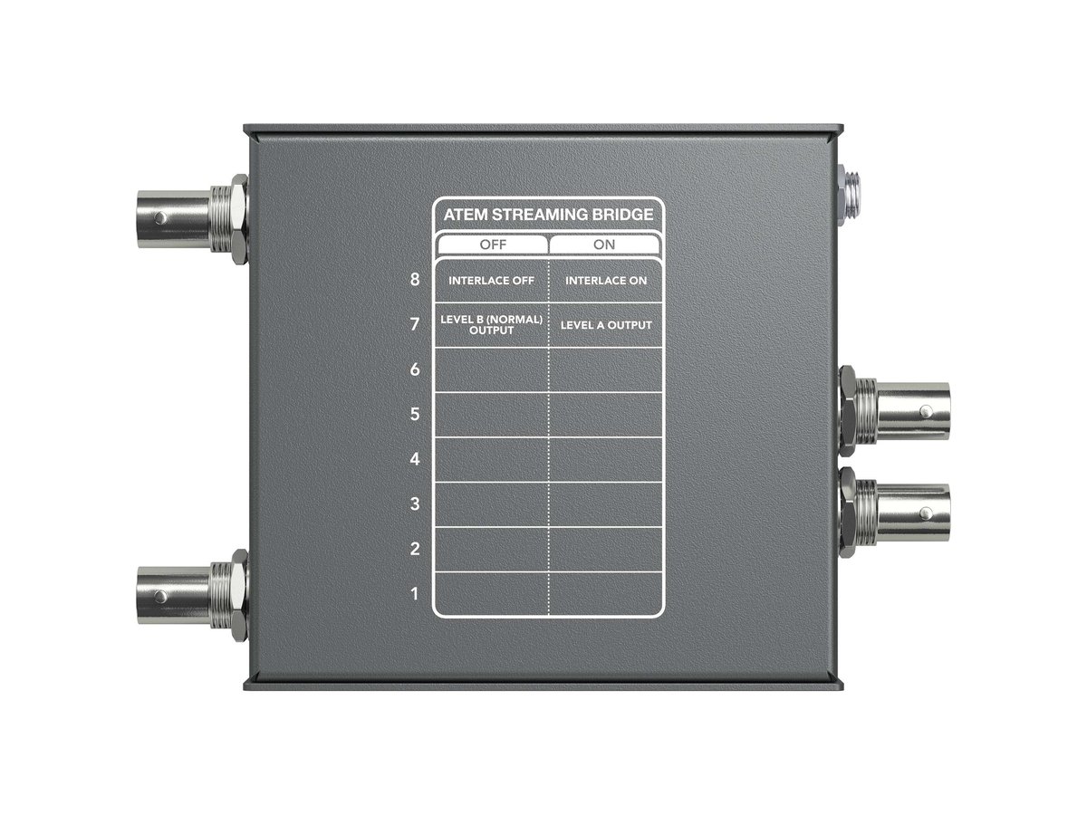 The Blackmagic Design ATEM Streaming Bridge for ATEM Mini Pro Streaming Switchers allows you to convert the IP signal from any ATEM Mini Pro unit into SDI and HDMI video. It features two SDI outputs and a single HDMI output and supports resolutions up to 1080p60. You can connect the Streaming Bridge directly to the streaming output of your ATEM Mini Pro, and it will provide SDI and HDMI output for use in broadcast environments, or directly to a monitor. You can also connect the streaming bridge to the same LAN that an ATEM Mini Pro is connected to, and the devices will find each other allowing you to easily stream across the network.