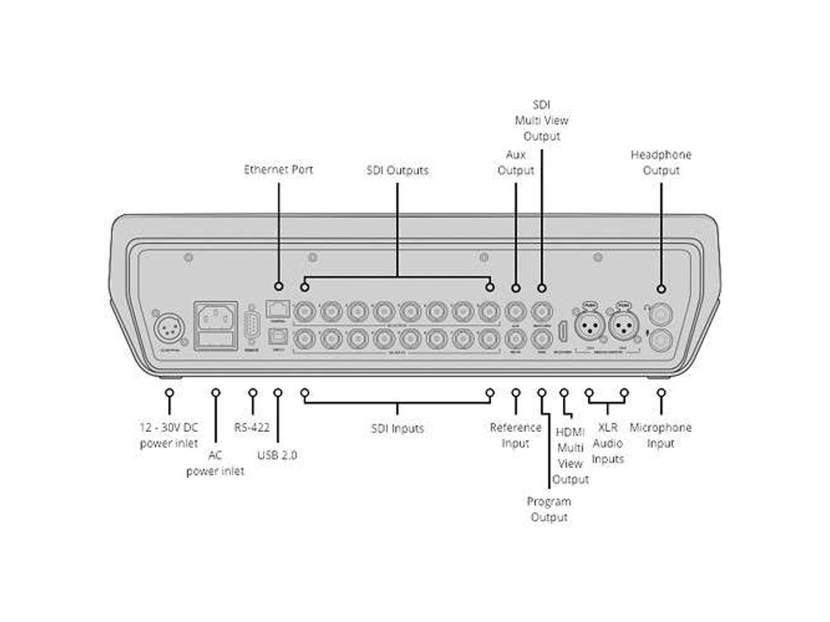 Multiview output is available for all eight channels, via HDMI or SDI, complete with tally, labeling, audio metering, and safe-area marking. A talkback function is available for director/operator communication with compatible cameras. The integrated Fairlight audio mixer features six-band parametric EQ, compression, limiting, and stereo simulation on analog and mic inputs. Mix solely from the panel, or use the multitrack interface on your Mac or Windows PC. Use the auxiliary output port to send your switched program or clean feed to a large-scale screen or other display.