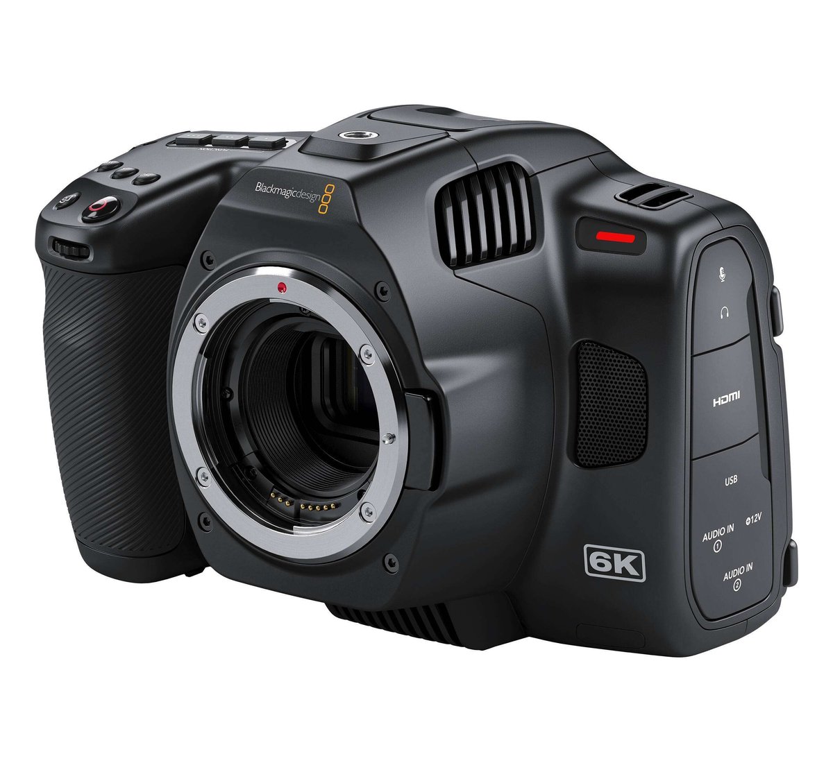 The compact 6K Pro retains the familiar controls and menu layout of the 6K model, such as ISO support up to 25,600, 13 stops of dynamic range, and 1920 x 1080 HDR monitor output. Professional audio support now includes two mini XLR inputs with phantom +48V power, a 3.5mm stereo input, a mono speaker, a headphone output, and a built-in stereo mic system.