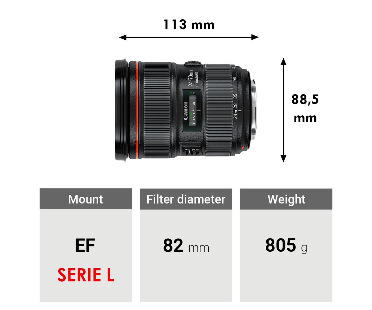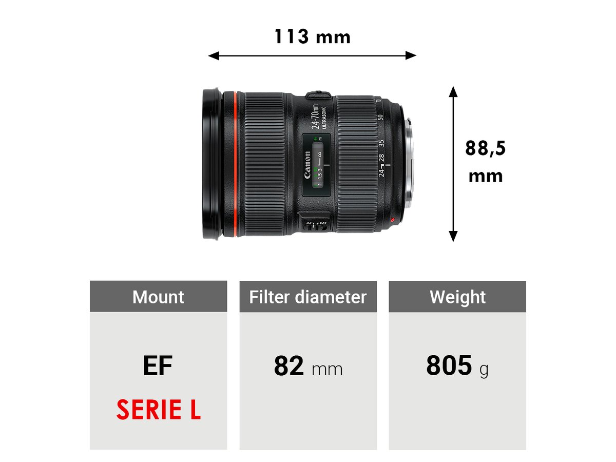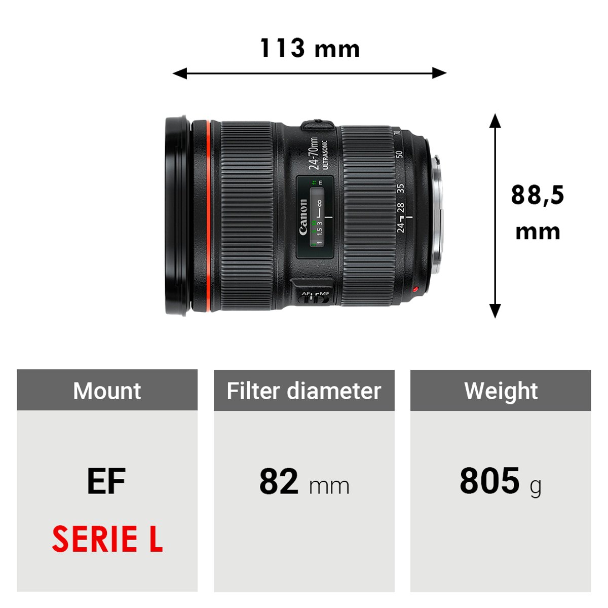 Spanning a popular and versatile range of focal lengths, the EF 24-70mm f/2.8L II USM is a Canon L-series zoom commonly thought of as the workhorse of lenses. Ranging from wide-angle to portrait length, this lens is also distinguished by its constant f/2.8 maximum aperture to benefit working in difficult lighting conditions and to afford greater control over depth of field. The lens is also characterized by its sophisticated optical design, which includes one Super UD element and two UD elements, which reduce color fringing and chromatic aberrations in order to realize a high degree of color accuracy and clarity. Three aspherical elements are also featured, and minimize distortion and spherical aberrations for improved sharpness. Additionally, a Super Spectra coating has been applied to individual elements to control flare and ghosting for high contrast and neutral color fidelity.