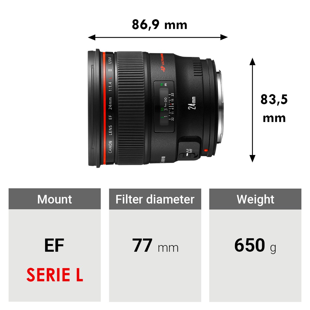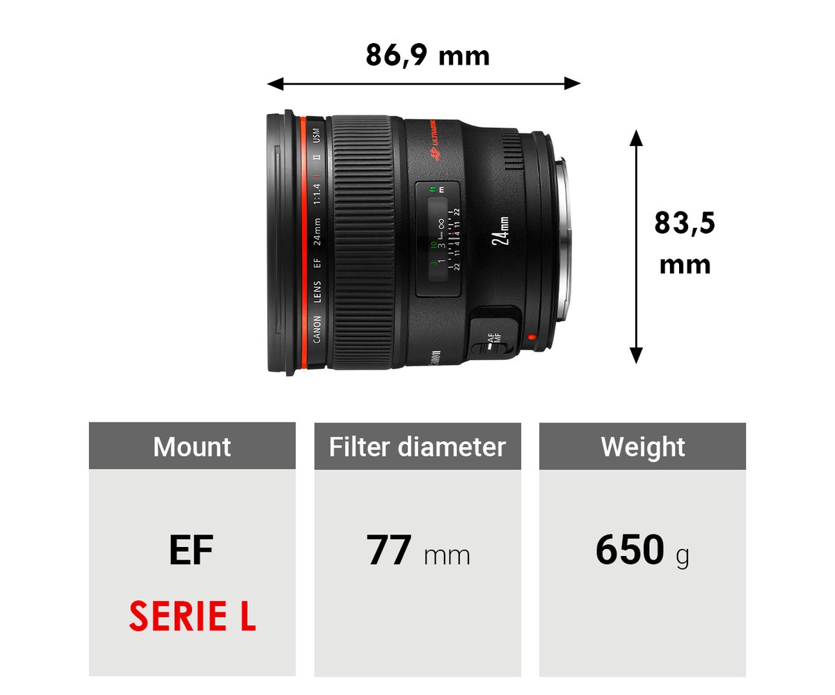 Blending a favored wide-angle focal length with a bright maximum aperture, the EF 24mm f/1.4L II USM is a Canon L-series lens characterized by a robust physical construction and sophisticated optical design. Two ultra-low dispersion elements help to control chromatic aberrations and color fringing while a pair of aspherical elements reduce spherical aberrations and distortion for high sharpness and clarity. Individual elements also feature a Sub Wavelength Coating to suppress lens flare and ghosting for improved contrast and color neutrality in a variety of lighting conditions. Besides the optical attributes, this lens is also distinguished by its fast f/1.4 maximum aperture to benefit working in low-light conditions for controlling depth of field. Additionally, this lens sports a ring-type USM for quick and quiet autofocus performance and full-time manual focus override, and an internal floating focus mechanism also helps to maintain consistent image quality throughout the entire focusing range.