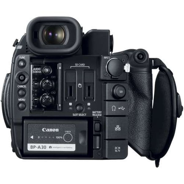 The C200 can also record Canon's Cinema RAW Light internally via its single CFast card slot. The camera also incorporates two SD card slots for recording UHD 4K/HD MP4 video. A built-in EVF enables the camera to maintain a small footprint when you shoot. However, the included removable 4" LCD screen as well as the included top handle and camera grip make this camera versatile for larger shoots. You can output video via the camera's SDI output, and the built-in XLR connectors provide two channels of audio at line, mic, and mic+48V level. A built-in Ethernet connector provides input/output control.