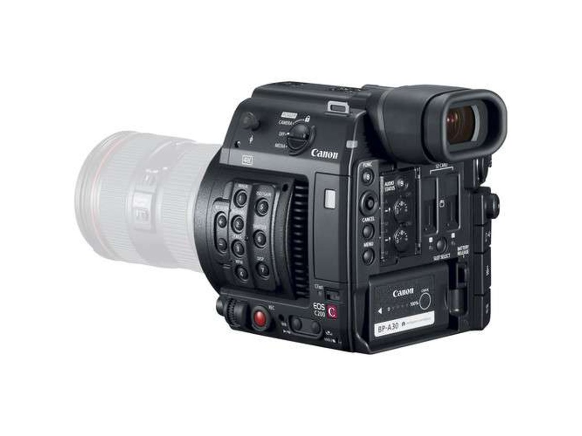 Canon's EOS C200 EF Cinema Camera features a built-in EVF, 4" LCD screen, top handle, Super 35mm CMOS sensor, and Dual Pixel Autofocus. The EF lens mount on the EOS C200 offers compatibility not only with Canon's existing broad range of DSLR lenses but also with their line of EF-mount CN-E cinema prime and zoom lenses. The Super 35mm sensor is paired with Canon's Dual DIGIC DV 6 image processor, allowing it to capture and record up to DCI 4K resolution.