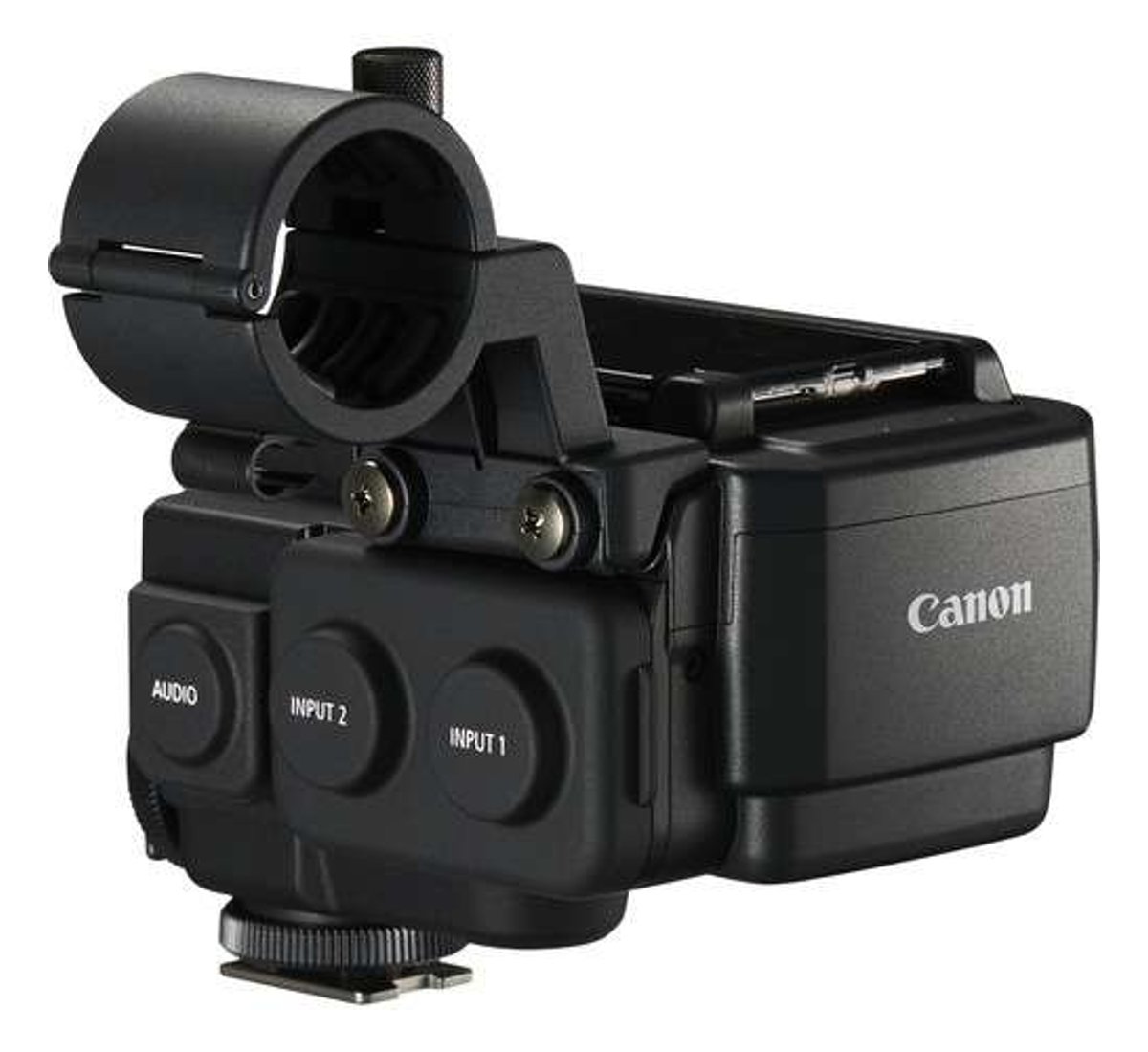 The MA-400 is geared toward single-user applications such as run-and-gun news gathering. It mounts to your camcorder's accessory shoe and offers an external mic holder to which you can mount external microphones with a diameter of 0.75 to 0.79". Included is a microphone cable clamp.