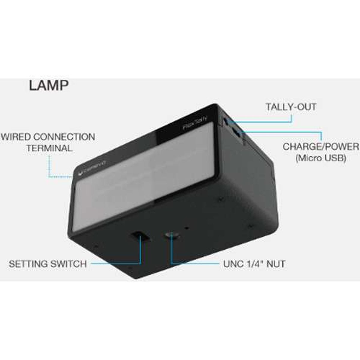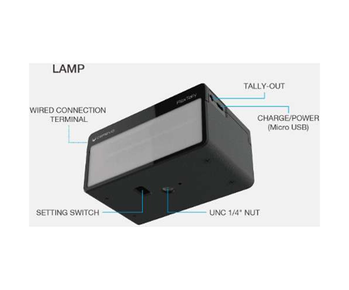 The station unit has an Ethernet port and 15-pin tally input, and the station unit and lamps each have an RS-485 terminal. The lamps provide a 1/4"-20 thread on the bottom for mounting on stands or directly to a camera via an optional shoe mount adapter. The FlexTally supports up to 16 lamps in total (up to eight when working over GPIO). A future firmware update is expected that will allow support for 32 lamps.