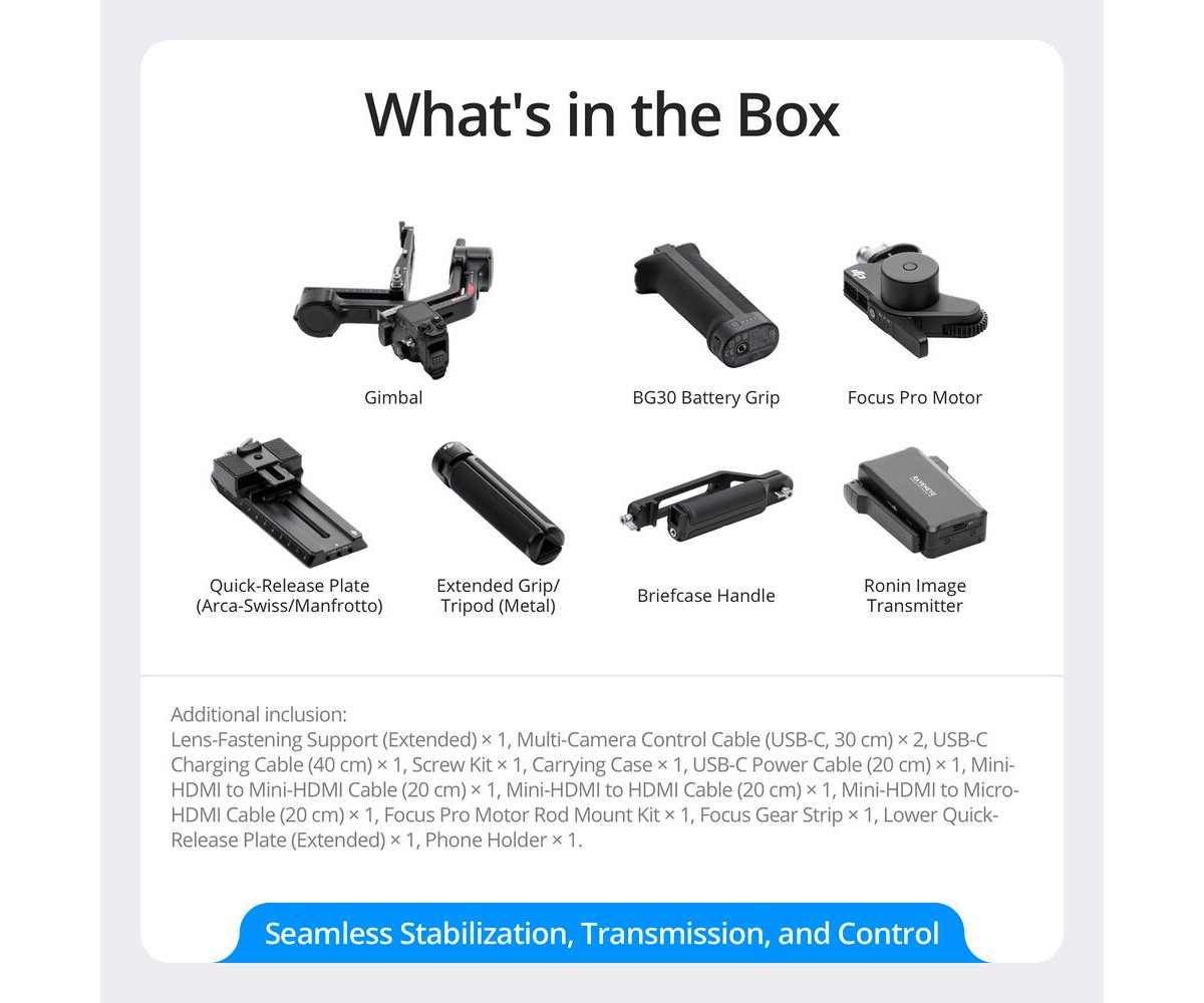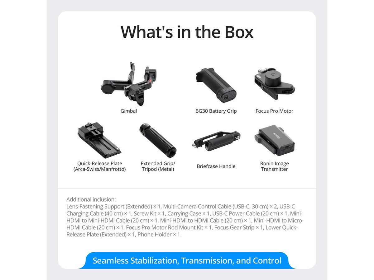 Enhanced operation efficiency, native vertical shooting, and an expanded accessory ecosystem make the DJI RS 4 Pro a powerful tool for the mirrorless camera shooter. The gimbal only weighs around 2.74 lb and sports a load capacity of 10 lb capable of supporting your compact camera build. The combo includes a Focus Pro Motor with a rod mount kit, a Ronin Image Transmitter, a focus gear strip, a briefcase handle, and a carrying case. Teflon-coated axes reduce friction for a smoother balancing and operating experience. Other intuitive features include a fine-tuning knob, auto-locking OLED screen, and RSA communication port for use with expanded accessories.