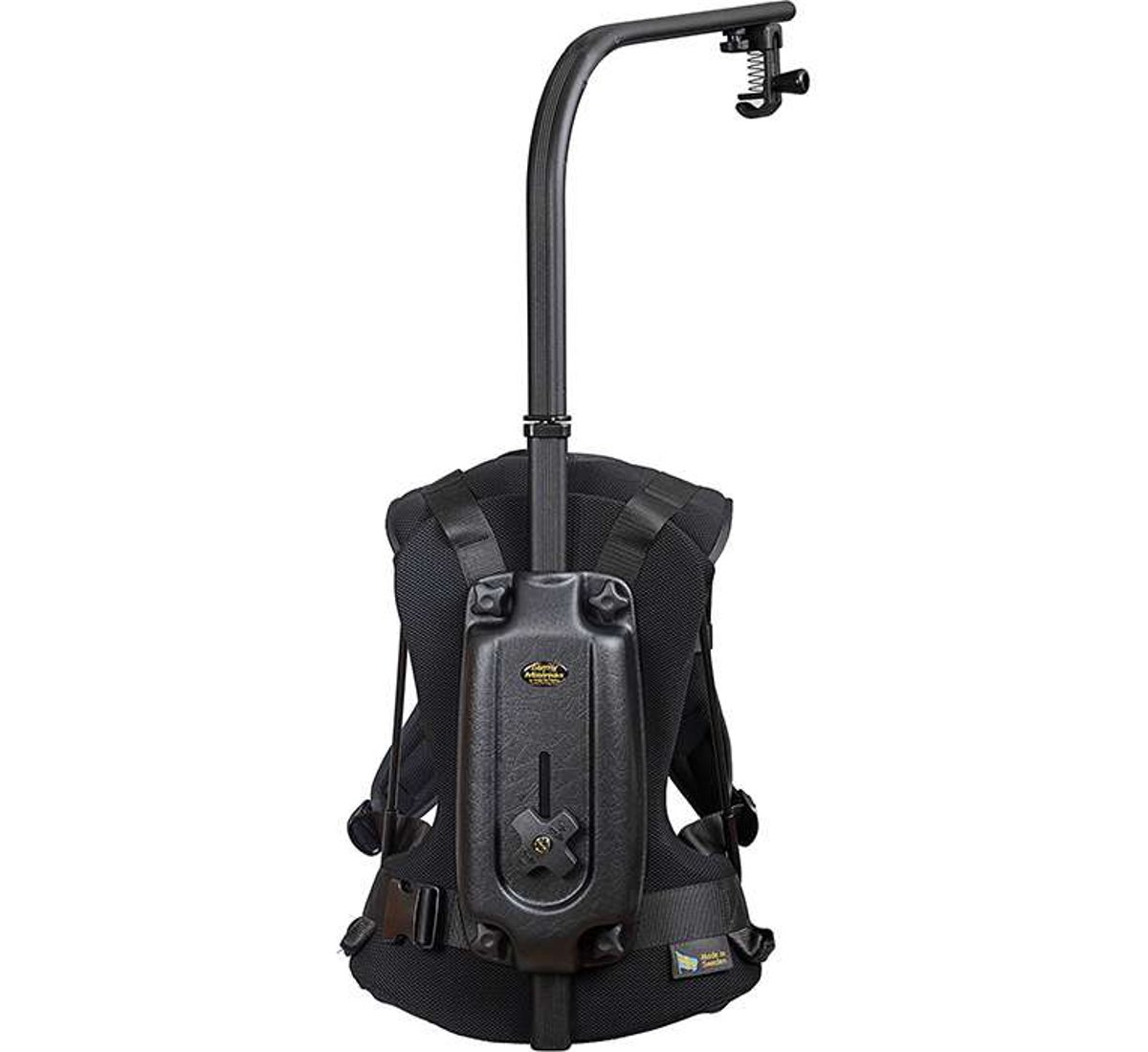 The Minimax model features a redesigned spring system which results in smoother support rope movement with reduced friction. A conical wheel unrolls the rope with increasing force as the rope is unraveled. Additionally, an overload protection system will trip if the maximum weight capacity is exceeded. Another improvement included in the Minimax model is the pivoting upper arm brought down from the Easyrig 3 Cinema model. The pivot allows you to swing the camera to the side, or even have it sit on your shoulder.