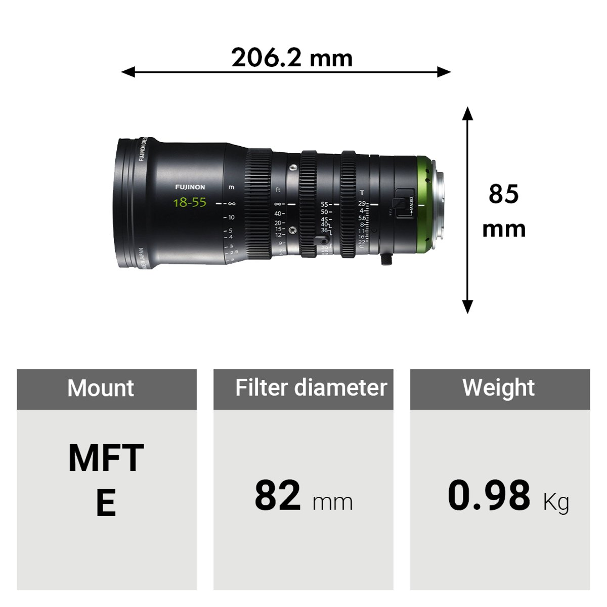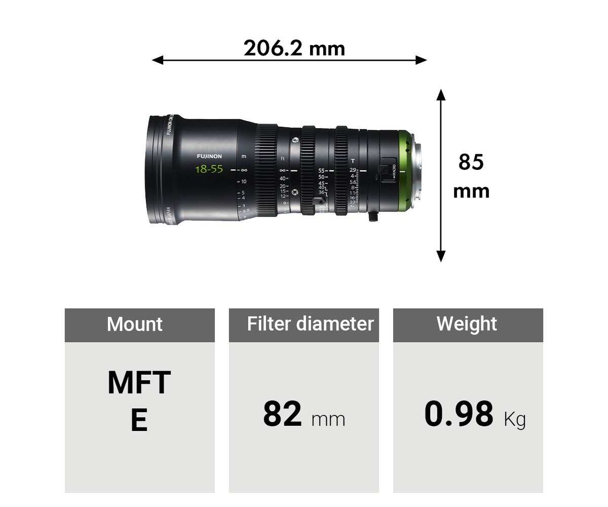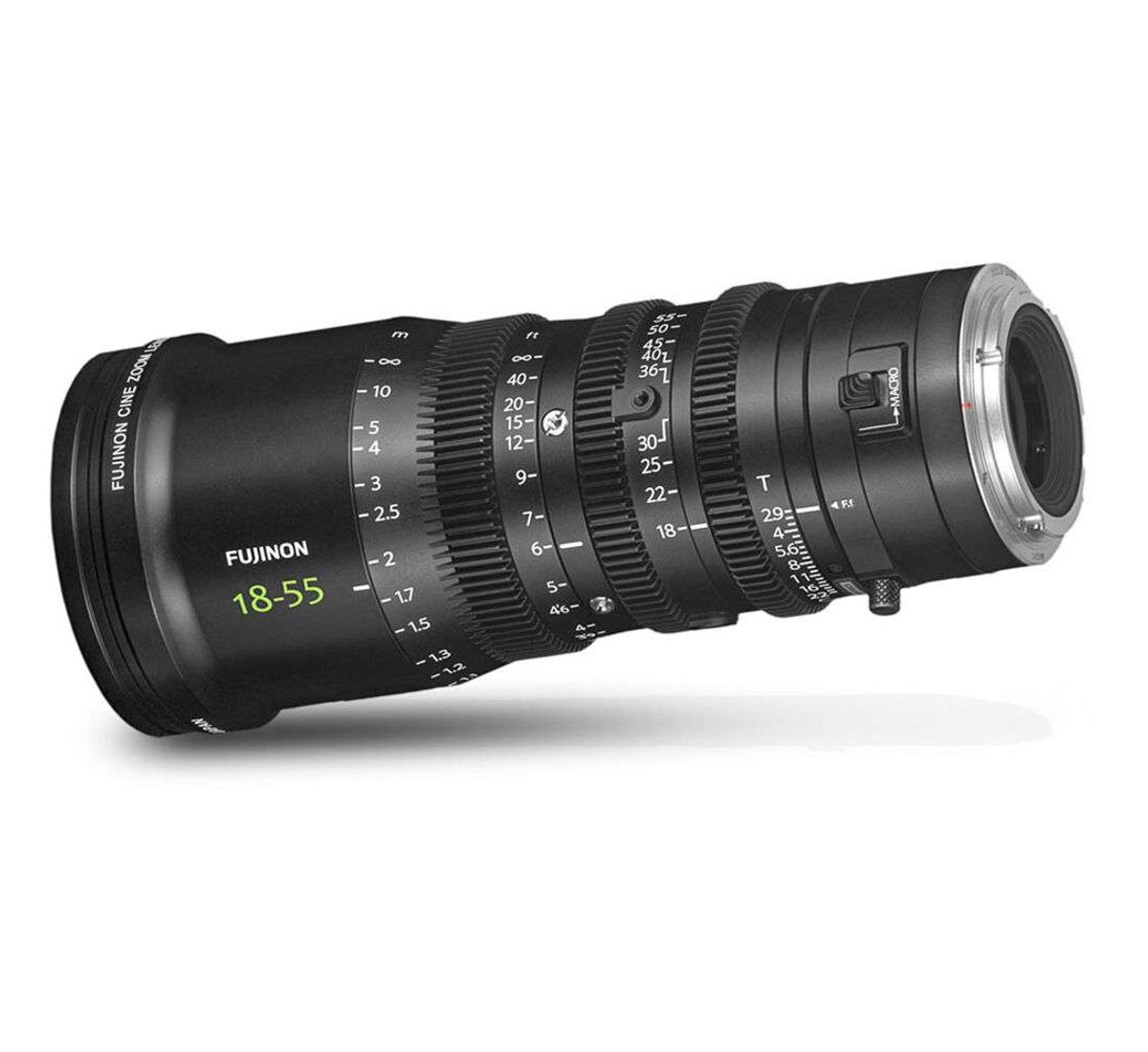 Il Fujinon MK18-55mm T2.9 con attacco E è uno zoom in stile cinematografico leggero per fotocamere con innesto E e sensore Super 35mm. Presenta un design meccanico con tre ghiere di controllo indipendenti: fuoco, diaframma e zoom. Ogni ghiera integra una dentatura in stile cine con modulo 0.8 MOD per l’interfacciamento con accessori cinematografici standard. La ghiera di messa a fuoco offre circa 200° di rotazione, garantendo spazio per regolazioni precise del fuoco, mentre il diaframma è privo di scatti (clickless), consentendo variazioni fluide dell’esposizione. L’obiettivo integra inoltre una modalità macro per riprese ravvicinate.