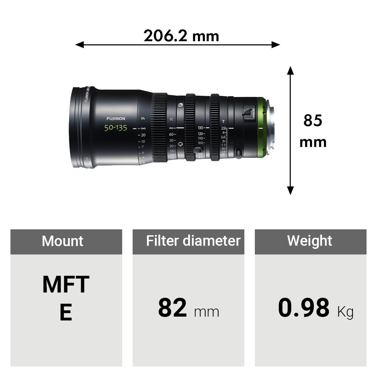 Il Fujinon MK50-135mm T2.9 con attacco E è uno zoom in stile cinematografico leggero per fotocamere con innesto E e sensore Super 35mm. Presenta un design meccanico con tre ghiere di controllo indipendenti: fuoco, diaframma e zoom. Ogni ghiera integra una dentatura in stile cine con modulo 0.8 MOD per l’interfacciamento con accessori cinematografici standard. La ghiera di messa a fuoco offre circa 200° di rotazione, garantendo spazio per regolazioni precise del fuoco, mentre il diaframma è privo di scatti (clickless), consentendo variazioni fluide dell’esposizione. L’obiettivo integra inoltre una modalità macro per riprese ravvicinate.