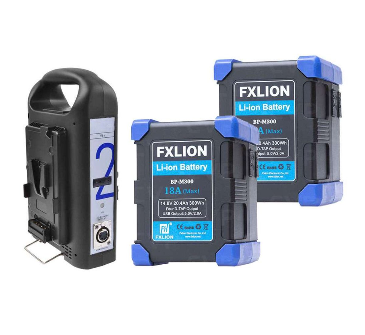 Kit composto da 2 Batterie FxLion BPM300 300Wh e un cariabatterie V-lock