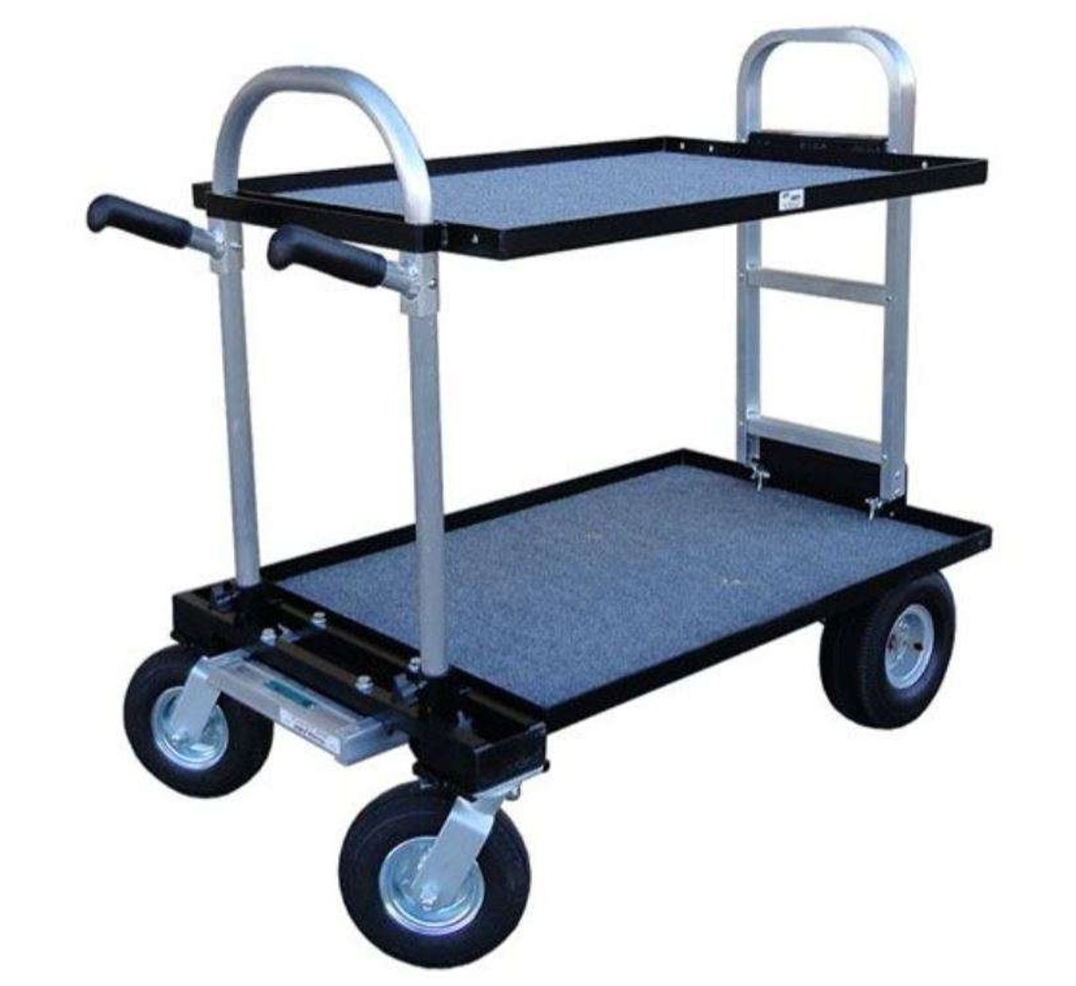 The truck has large (260mm dia) standard Magliner pneumatic wheels and two medium (200mm dia) braked pneumatic castors near the handle. Each truck is fitted with two carpeted shelves. This model is very popular in the film industry for carrying cameras, battery packs, generators, lighting etc. The Magliner Backstage Junior can be folded to allow for easy transportation by air or otherwise.