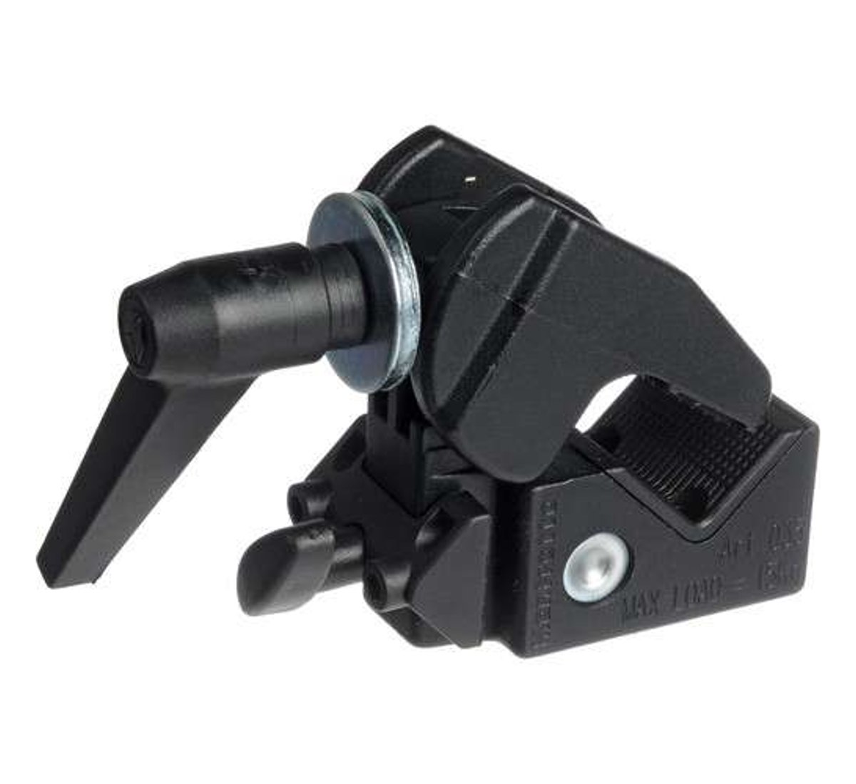 The Manfrotto 2915 Super Clamp is made of lightweight cast alloy. The Super Clamp is a very versatile tool and it holds just about anything: cameras, lights, umbrellas, hooks, shelves, plate glass, cross bars, even other Super Clamps. In turn, the Super Clamp can be securely mounted on any tube from 0.5" to 2.1". An attached wedge can be removed and placed in the jaw for flat surfaces. A built-in socket allows the use of over 30 attachments to hold anything from backgrounds to lighting fixtures.