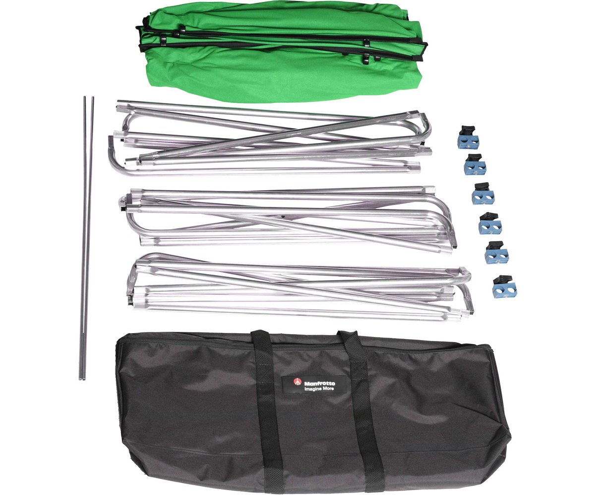 • N.1 Green Chroma Key Fabric • N.24 Black Cover Clips • N.2 Background Frame Outer • N.1 Background Frame Inner • N.2 Frame Stretcher Bar • N.6 Frame Clamp • N.1 Carry Bag