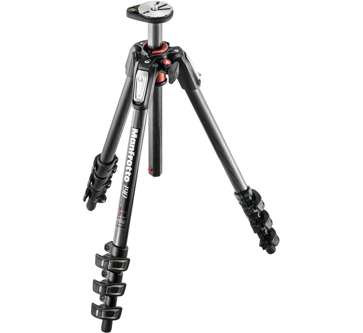 he black, redesigned MT190CXPRO4 Carbon Fiber Tripod from Manfrotto builds on the success and popularity of the previous 190 series with professional hardware and convenience features that make it even easier to use than its predecessor. When the three leg sections and center column are fully extended, the tripod reaches a maximum height of 63", and its load capacity of 33 lb makes it a good choice for larger cameras. The tripod weighs 3.6 lb, and folds down to 20.6" for transport.