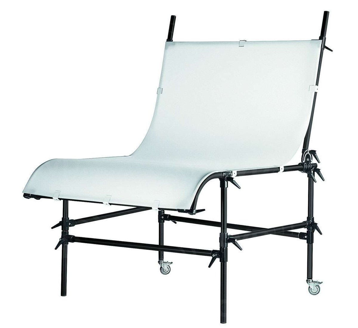 The Plexiglas measures 125cm by 79cm, and can quickly be mounted with the included fastener tape. The impressive panel reaches a vertical height of 193cm when the back is in it's vertical position. With a dimension of 200 cm by 122 cm, you'll be able to capture a wide range of items in their best light. Also featuring an adjustable tilting back, you'll be able to make small adjustments with ease. This still life table can also be fitted with wheels for easy manoeuvrability.