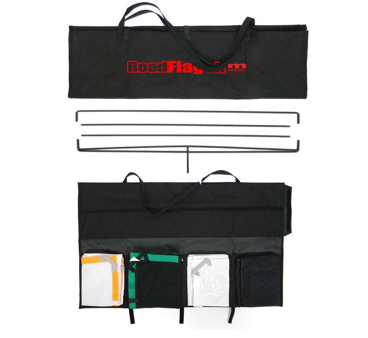 Reminiscent of the popular RoadRags, this 120x120 cm RoadFlag II Kit from Matthews allows you to take full-sized light controls on the road. The kit includes 2 collapsible "breakdown" frames, a slip-on single black scrim, a silk, a silver lame and a solid black flag. The frames have been redesigned from the original RoadFlags frames so that they break down into 4 pieces, allowing them to fit in a smaller, included 40x70 cm carry case.
