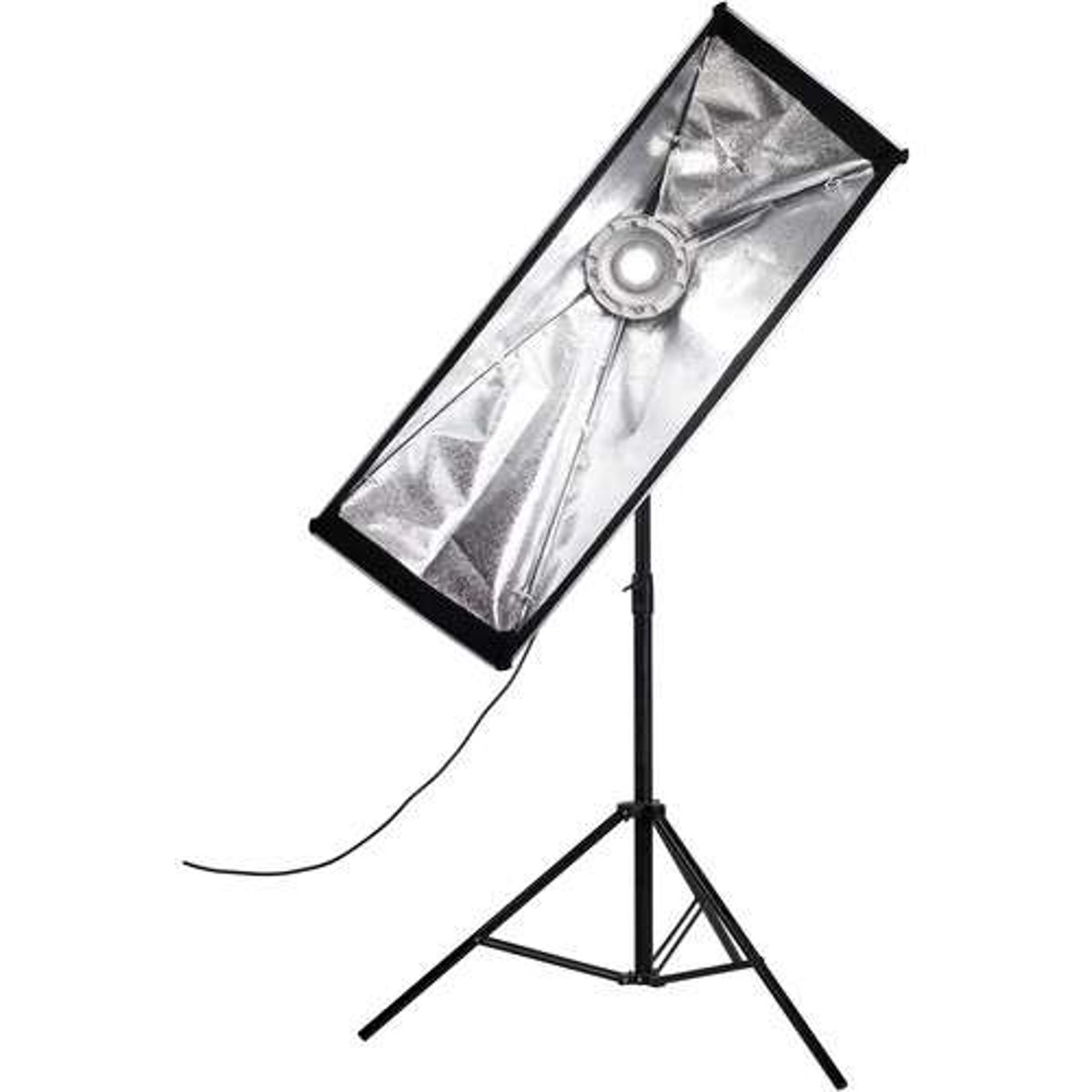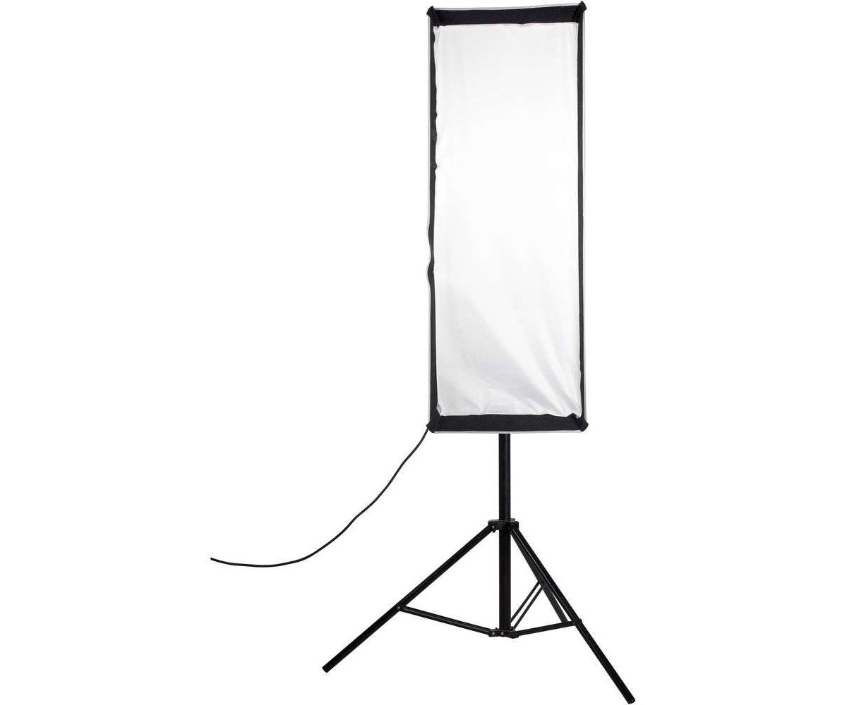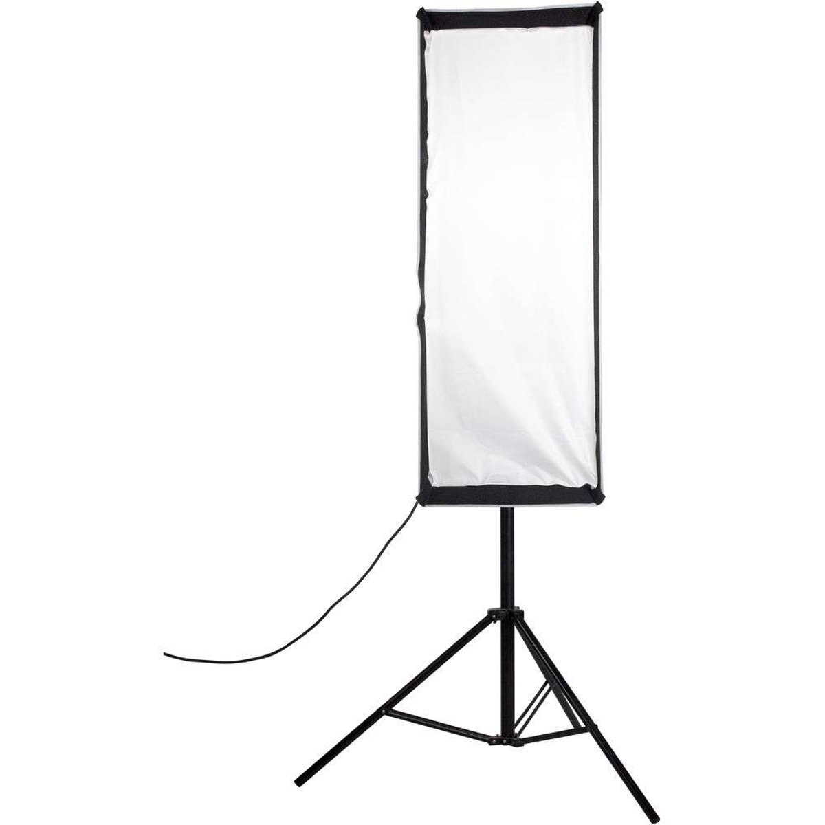 Dramatically soften the light from your strobe or light source with this 18 x 43" Asymmetrical Stripbank Softbox from Chimera. Compatible with lights utilizing a Bowens-mount speed ring, this modifier features a strip shape that is thinner than standard softboxes. This creates a narrow light output with limited spill that is well-suited for accent, hair, and rim lighting, as well as rendering long, elegant highlights on glassware and reflective objects. The Stripbox has a removable front panel and a silver interior for maximum output.