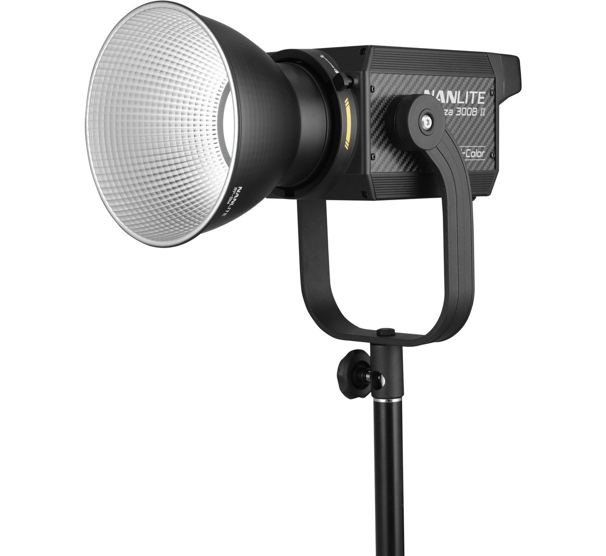 The light's upgraded curved rotating yoke has a one-sided lock, forward articulation, and allows 360° rotation to provide a greater tilting range with optional large modifiers. It also features an incorporated umbrella holder to expand your light-shaping options. Additionally, the light's Bowens mount capability makes the Forza 300B II compatible with a wide range of modifiers.