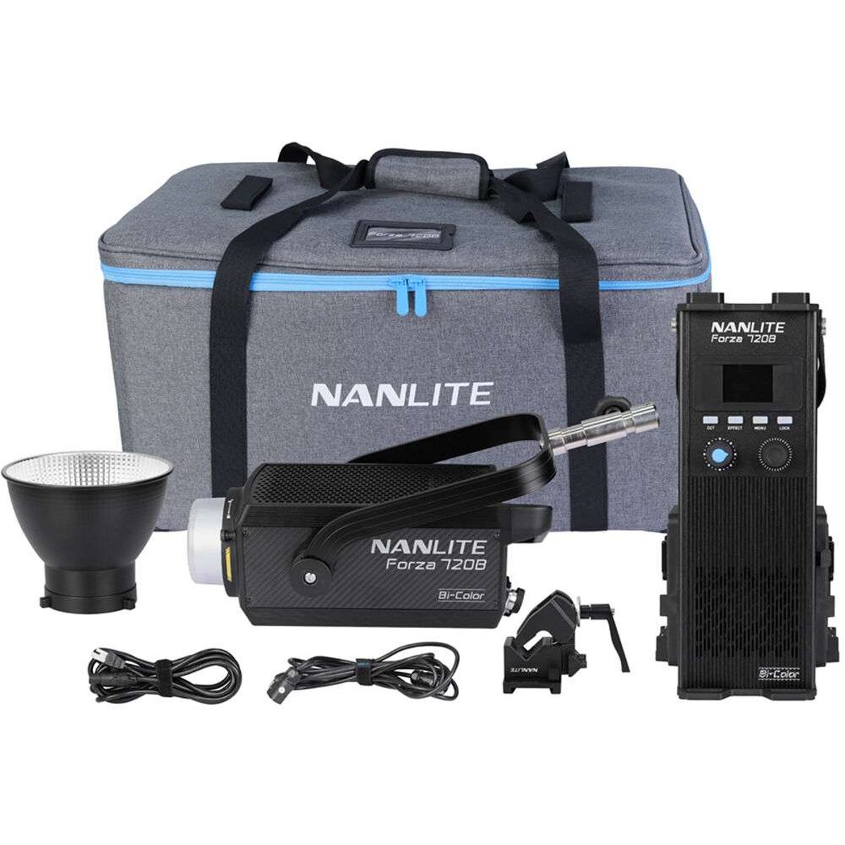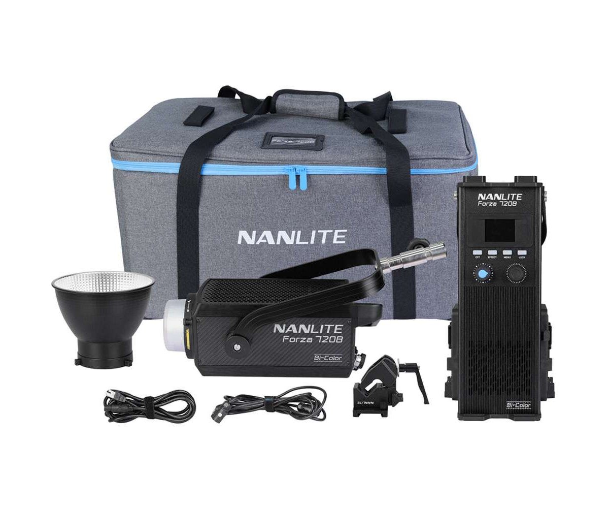 The Forza 720B Bi-Color LED Monolight from Nanlite is made to fill production roles usually handled by powerful HMI lights in a much more lightweight, compact, and heat-efficient package, with the added benefit of adjustable bi-color control. The COB LED component can deliver an immense amount of accurate, high CRI and TLCI light with a rated power of 800 watts, while being nimble enough to dim from 0 to 100% in 0.1% increments. It offers a suite of wireless control options, for single lamp operation or more complex multi-light setups. Twelve built-in practical effects can create complicated lighting scenarios in seconds, which can be customized and saved as quickly recallable presets with the free NANLINK mobile app.