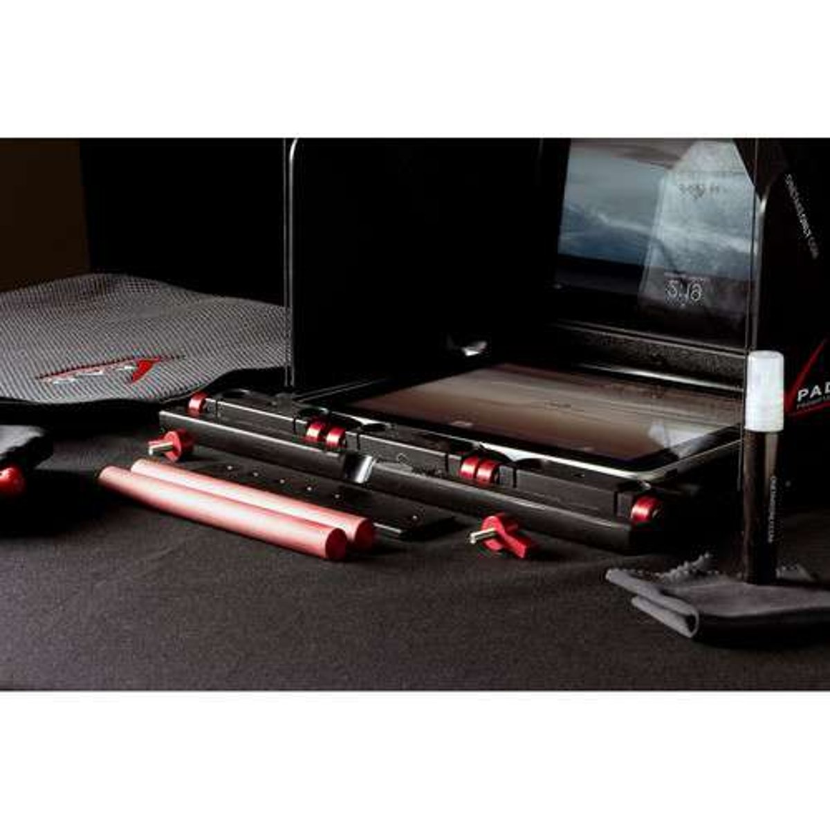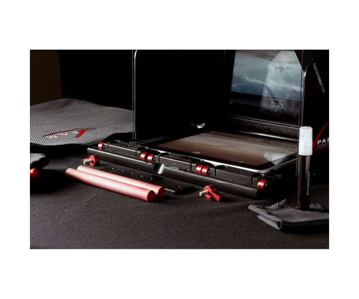 The Pad Prompter for 15mm Rigs, from Onetakeonly, is a compact tablet teleprompter designed to be attached to the front of your 15mm camera rig with included rods and rod adapters. It's meant to be used attached to your rig while your rig is mounted on a tripod. It supports all iPads measuring up to 10" diagonally, including iPad mini (iPad Pro is not supported). It also supports all other similarly sized tablets. When you remove all the rods and rod adapters, you can collapse the Pad Prompter to a flat 1.2" thick, making it very easy to carry in most bags or simply in your hands. (A camera rig is not included. All you'll need at minimum is a tripod-mount baseplate with 15mm rods.)