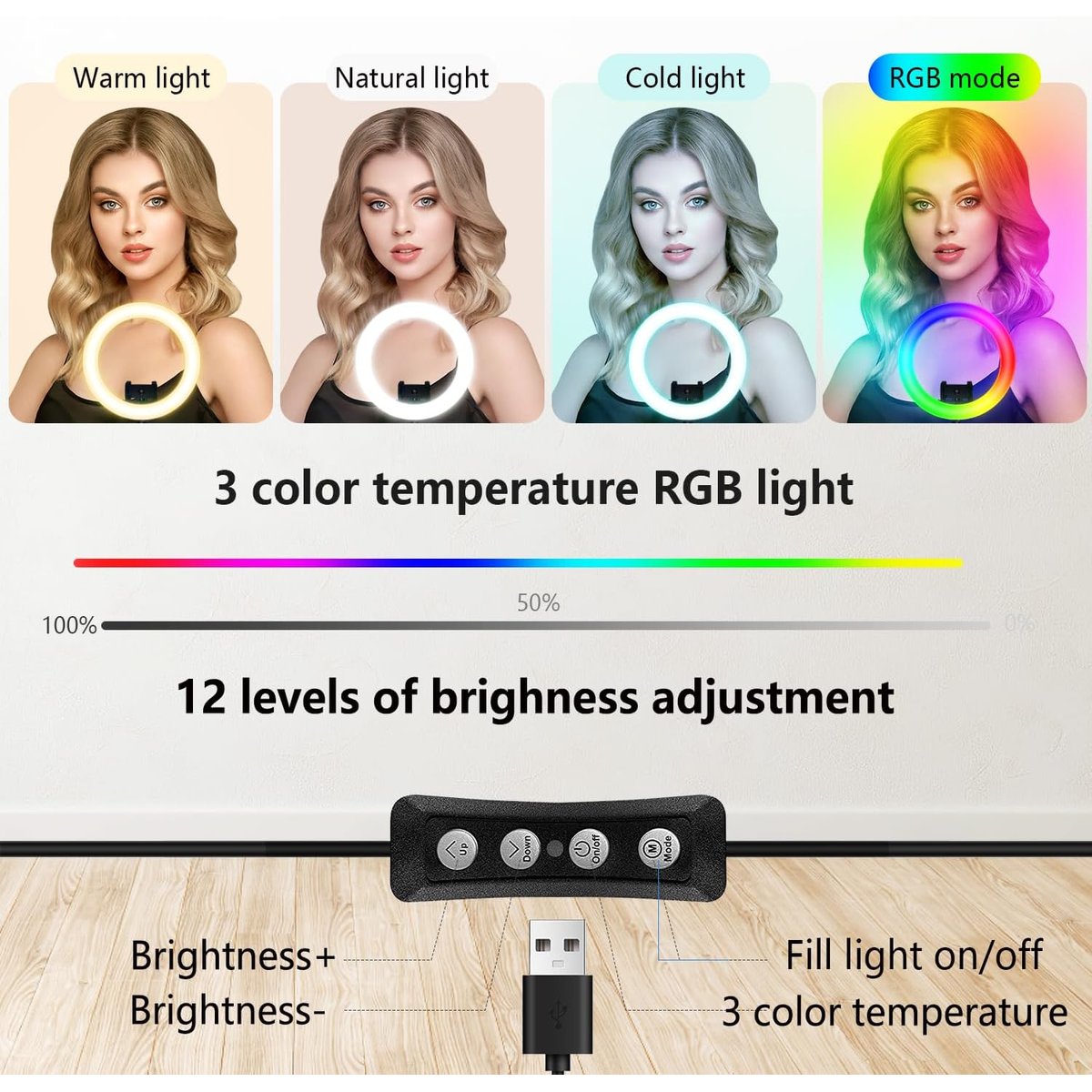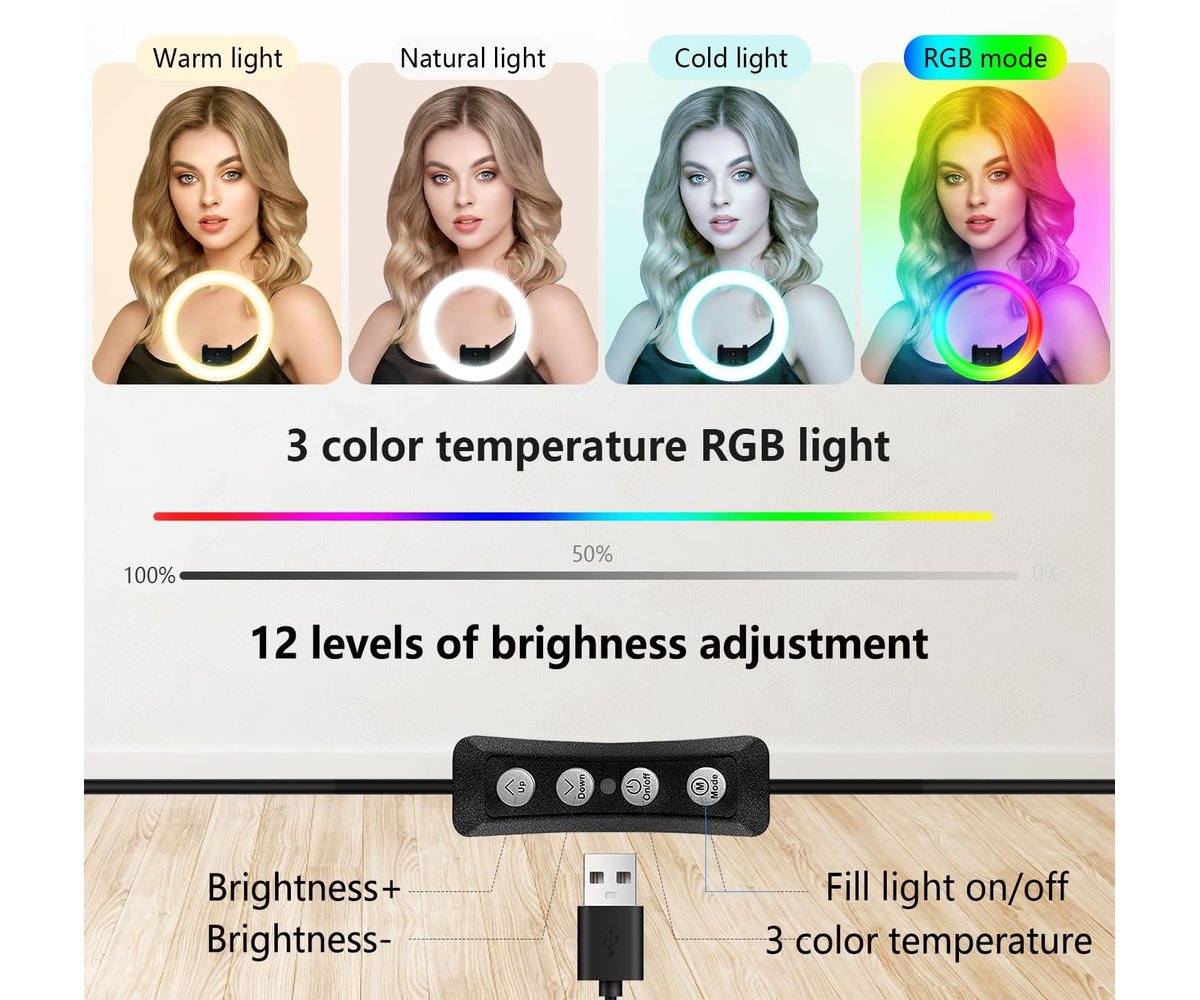 - Dimmable LED Ring Light: Features a selfie ring light with three color temperatures (warm, natural, cool), vibrant RGB colors, and 12 levels of brightness. This allows for customized lighting to suit any environment.
