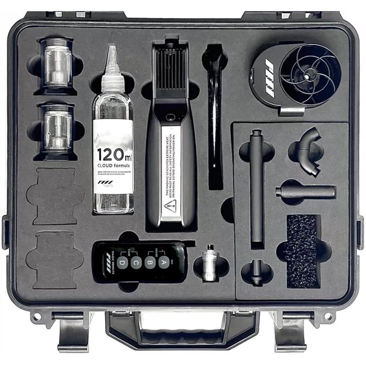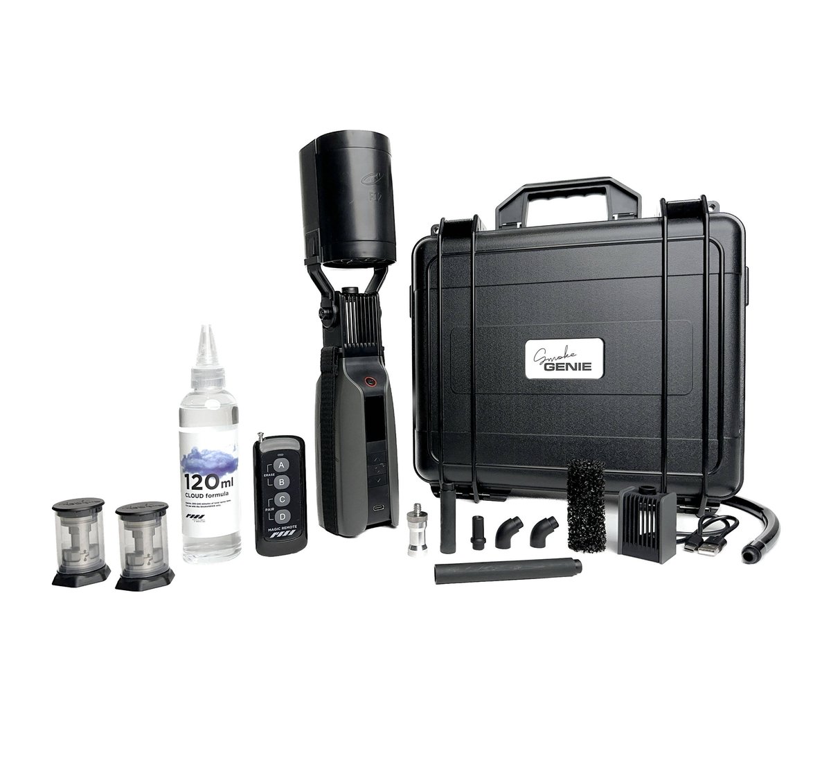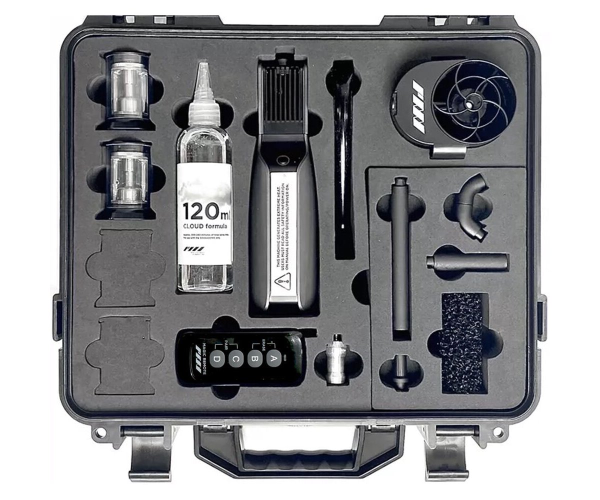 In addition to the SmokeGENIE device, the Professional Kit includes a wireless remote, two replaceable smoke chambers, a cinematic haze fan adapter, four precision smoke-shaping nozzles, a liquid-smoke nozzle, and a 12" silicone extension tube. Cloud Formula fluid (60ml) is provided to get you started right away. Three 18650 li-ion batteries and a 23A battery are included to power the SmokeGENIE and the remote. Keep your SmokeGENIE and accessories secure when traveling with the included protective hard case.