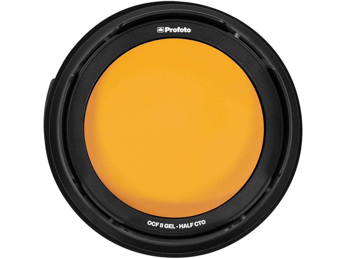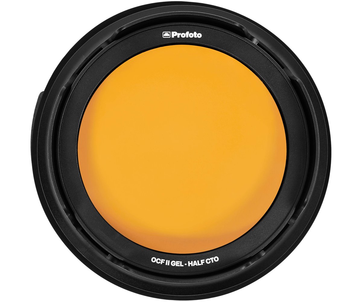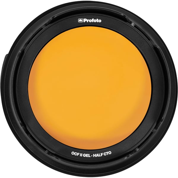 Designed for use with the B10, B10 Plus, and B1X, this amber Profoto OCF II Half CTO Gel Filter mounts magnetically to the OCF II Grid and Gel Holder or the OCF II Barndoor. The filter warms daylight 5500K to about 3800K tungsten balance for a late afternoon effect or for use as a hair or accent light. The filter easily stacks with optional grids for selective lighting.