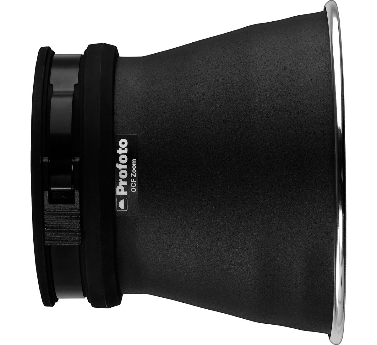 Compatible with the B1X, B1, B2, B10, D1, and D2 Flash Heads, the OCF Zoom Reflector from Profoto allows you adjust the beam angle of these lights from 55 to 85 degrees by moving the reflector back and forth along the body of the light. The highly reflective modifier will boost the output to 1.2 stops. While at just 6" in diameter, it's small enough to fit into the Profoto Backpack M, Bag XS, or Bag S Plus while mounted on a head.
