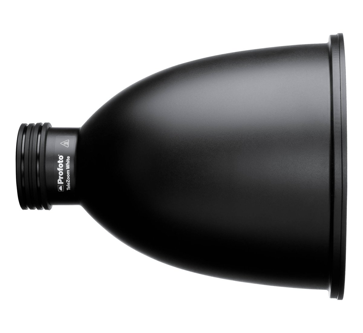 Profoto continues to expand its versatile hard reflector line with the white TeleZoom Reflector. Designed for long-throw use, the TeleZoom Reflector has a deep shape and white-coated interior to create direct, soft light. By boosting the light output from a Profoto flash head, the TeleZoom works great if you require even illumination over long distances.