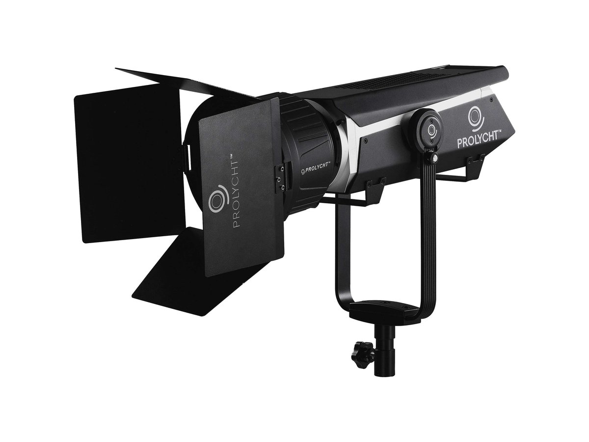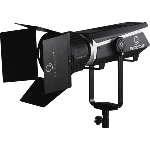 The Prolycht Orion 300 FS 2x Fresnel Kit mounts to the Orion 300 FS light using a Bowens Mount. The Fresnel lens has a 15-degree to 30-degree flood/spot beam angle adjustment. The kit includes a four-way barndoors set to further adjust the beam angle, and these barndoors can also be mounted to the Orion 300 FS reflector. The kit comes with a padded carry case for storage and transport.