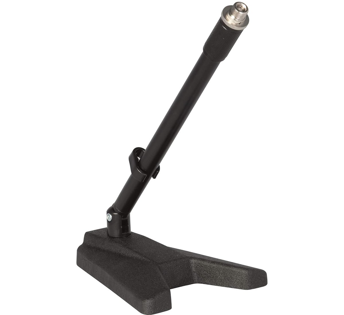 The base has a front width of 15 cm (5.9"), a back width of 6 cm (2.4"), a depth of 19 cm (7.5") and a height of 3,3 cm (1.3"). The stand's base displays harmonious design and elegant shape, and features a large footprint that, combined with a substantial weight of 2.5 kg (5.5 lb), allows the mic stand to remain securely firm wherever positioned. Thanks to its practicality and sturdiness, it can be used on floor to mic a bass drum or an amplifier cabinet, or as a table stand for conference rooms or for streaming and podcast stations.
