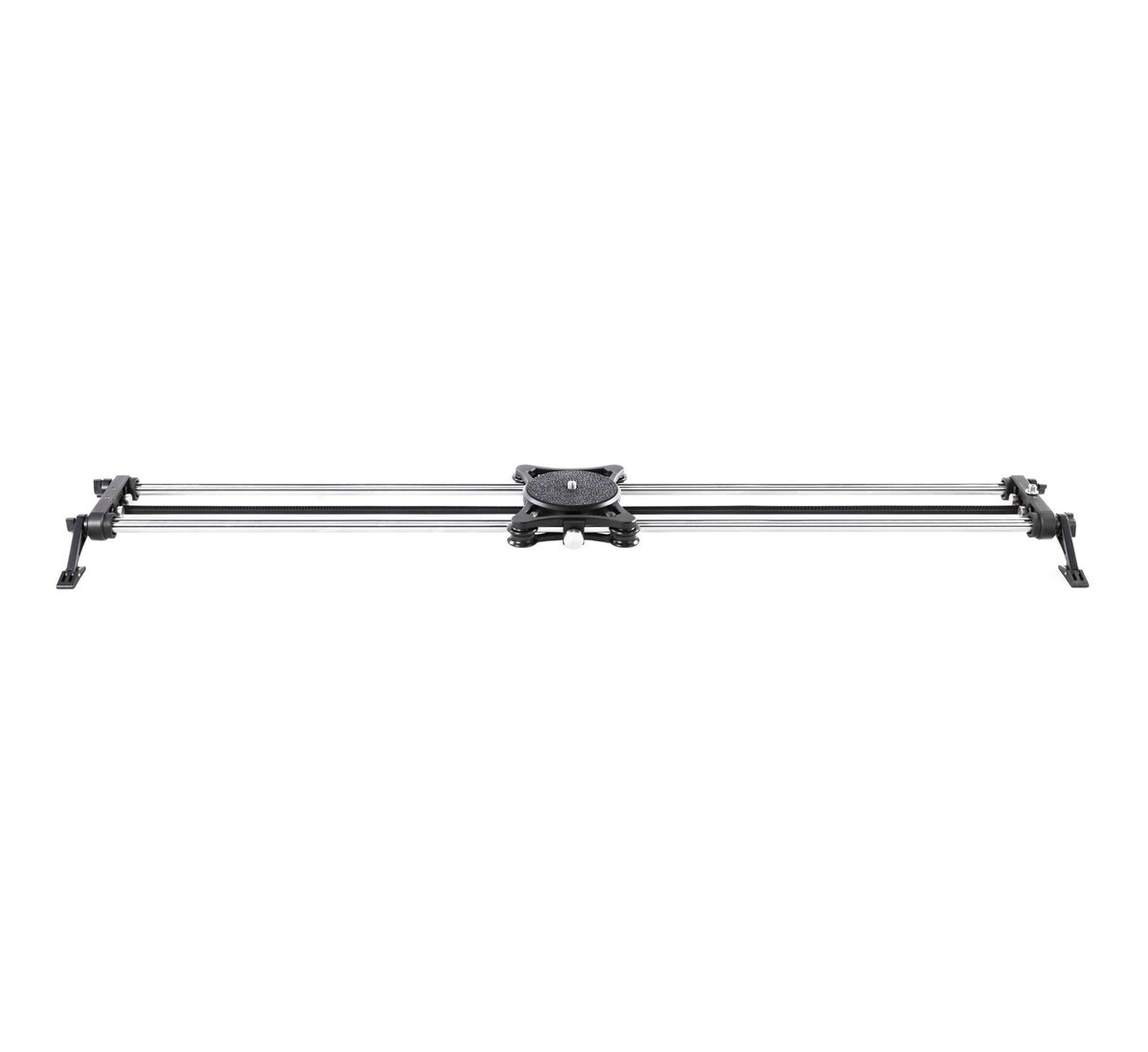 The Rhino Slider EVO features a 3/8"-16 screw on the camera carriage for attaching a ball head or flat-base fluid head. It can be center-mounted on a tripod via 1/4"-20 and 3/8"-16 threaded holes in the center of the rails, or supported using two tripods or stands via 1/4"-20 and 3/8"-16 threads at the ends of the tripod. You can also setup the slider for ground-level or table-top shooting using the included spring-loaded legs with index marks. The legs fold up for compact storage.
