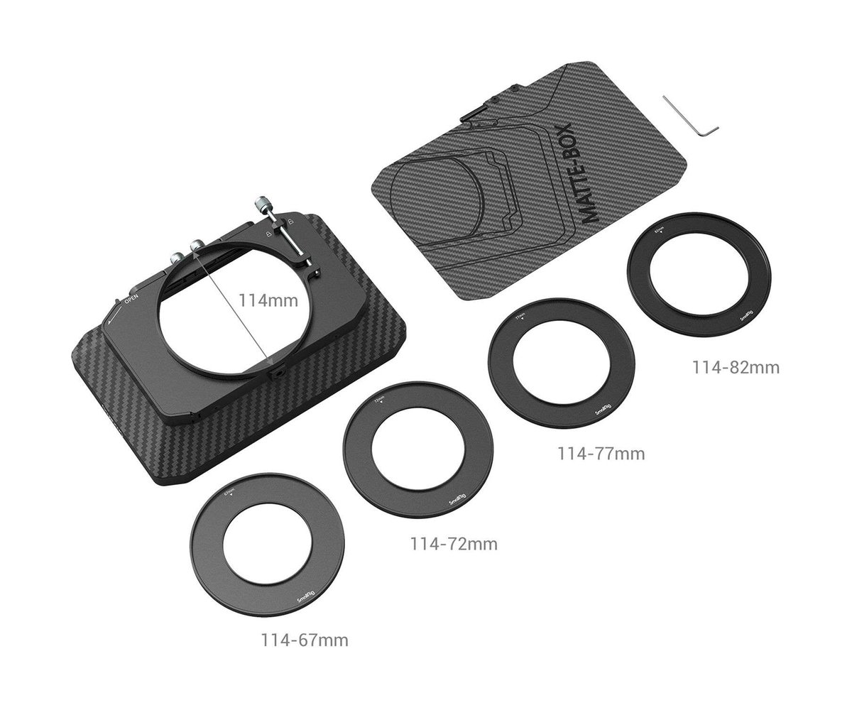 The matte box features a 114mm diameter opening, and the included 67, 72, 77, and 82mm threaded adapter rings allow you to use the matte box with lenses of different sizes and diameters.