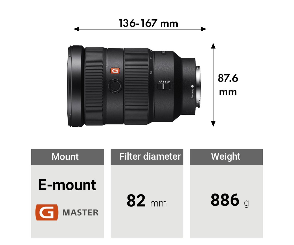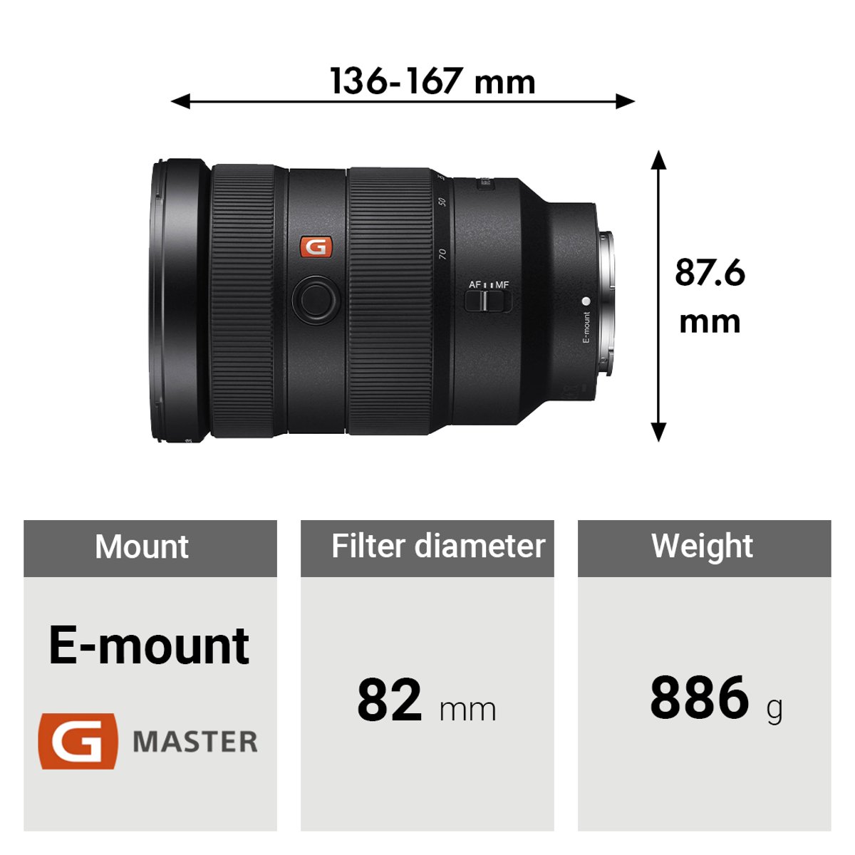 - Covering wide-angle to portrait-length perspectives, this standard 24-70mm zoom is designed for full-frame E-mount mirrorless cameras and is also compatible with APS-C models, where it will provide a 36-105mm equivalent focal length range.