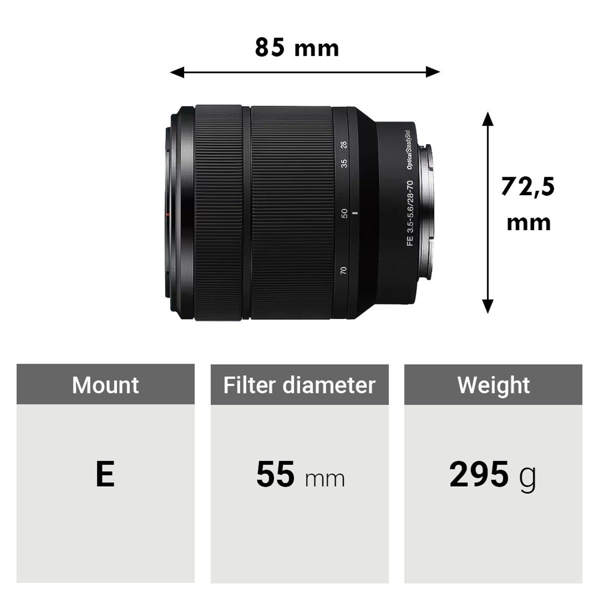 - Designed for full-frame E-mount cameras, this 28-70mm covers a versatile wide-angle to telephoto range. It also works on APS-C format cameras where it provides a 42-105mm equivalent focal length range.