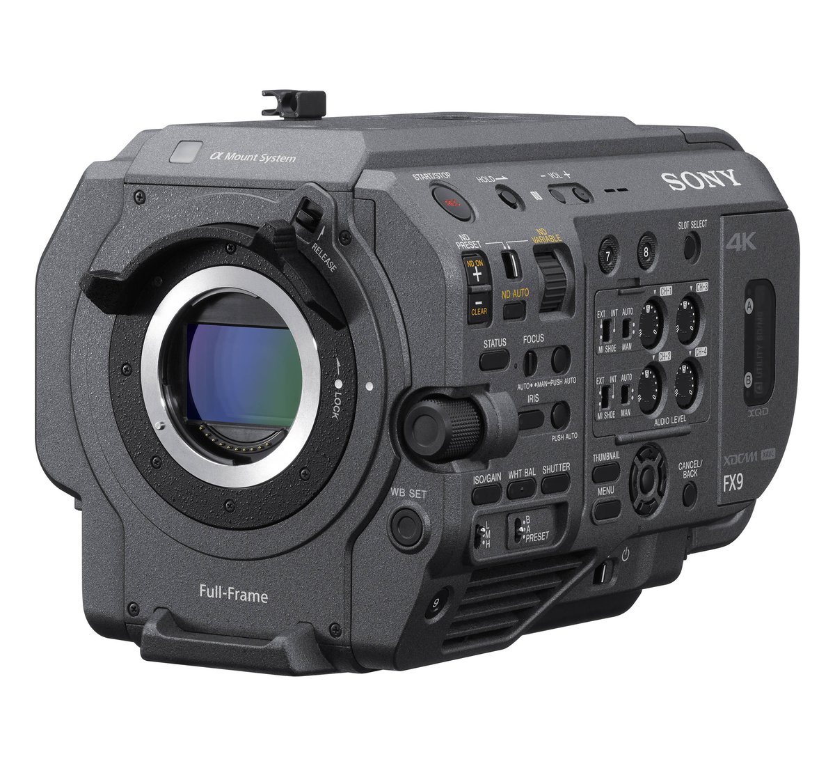 Le caratteristiche operative includono un filtro ND variabile elettronico a 7 stop (da 1/4 a 1/128) con modalità auto e manuale, e un sistema Fast Hybrid AF che utilizza 561 punti a rilevamento di fase coprendo circa il 94% del frame. Il sistema AF include la funzione facial detection, velocità di transizione regolabili e vari livelli di shift sensitivity. Per la stabilizzazione, i metadata del giroscopio interno permettono la compensazione del mosso in post-produzione tramite il software Sony Catalyst.