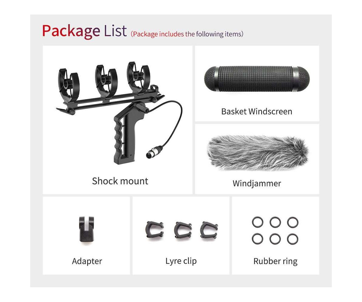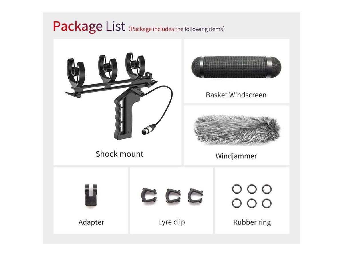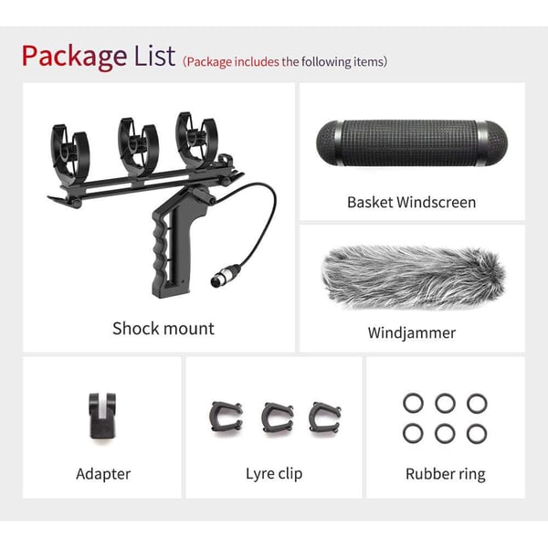 The silicone-rubber shockmount has ternary holders for its mic clips, which are fixed by four elastic bands. This allows the mount to absorb shocks, vibration, and handling noise, allowing for smoother recording. A 3/8"-16 mount is provided at the handgrip to mount the pistol grip onto boompoles and similar items.